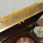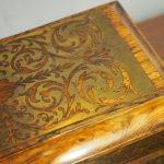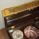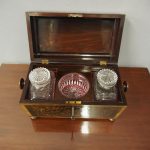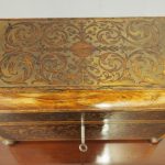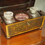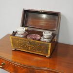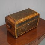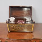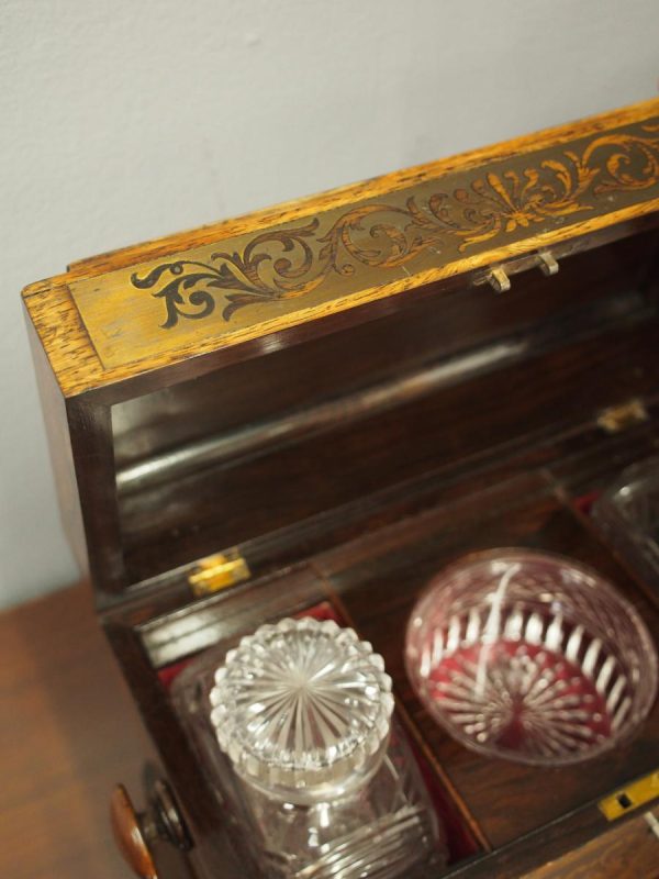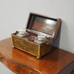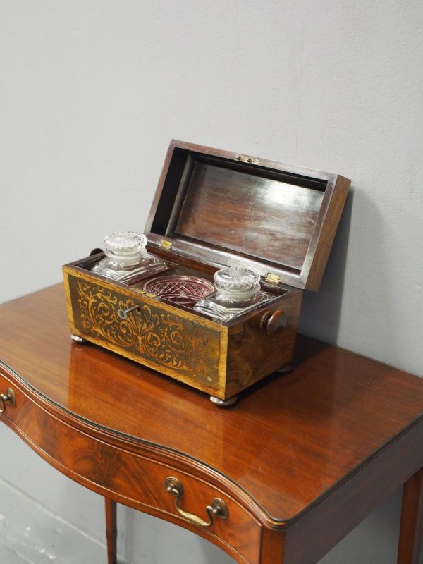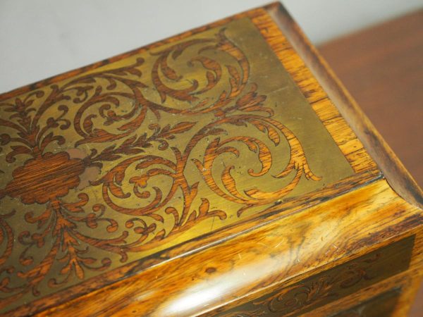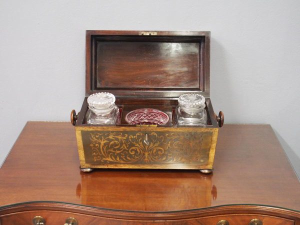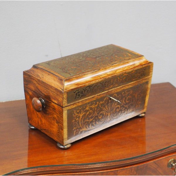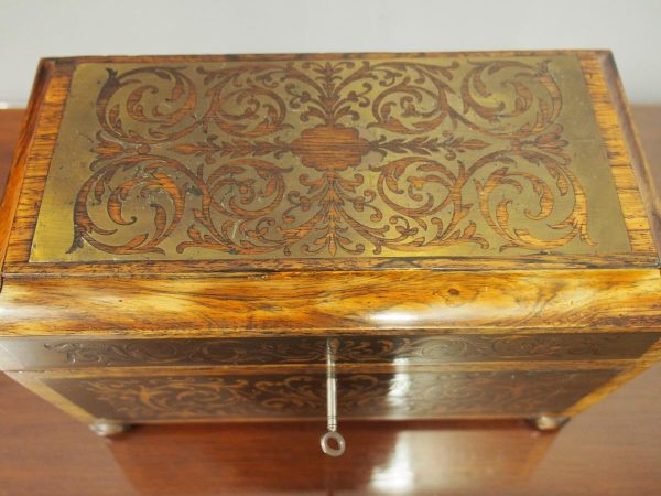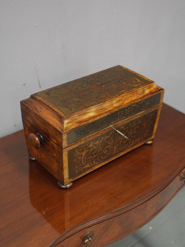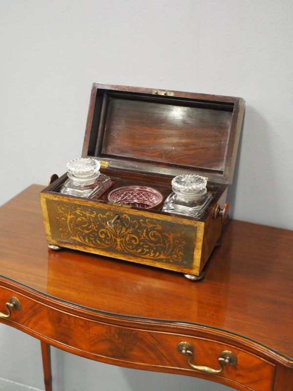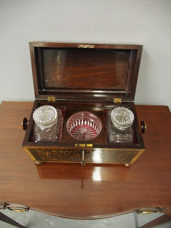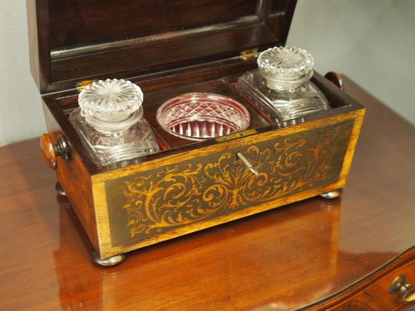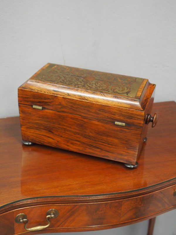 Circa 1810, quality brass-inlaid rosewood tea caddy with original fittings. The sarcophagus shaped caddy with pagoda top is profusely inlaid with foliate design cut brass on lid, frieze and front, turned carrying handles all over neat turned feet. It has its original working lock and key. The interior with rare cut glass tea bottles (one is damaged) and lids and mixing bowl.