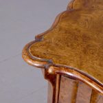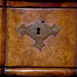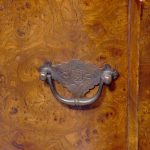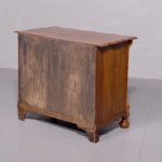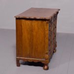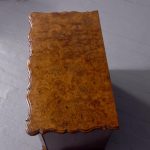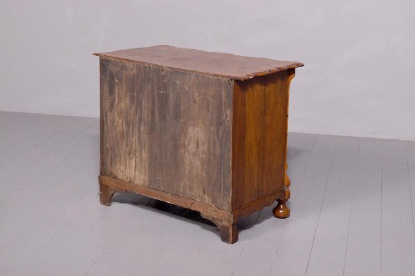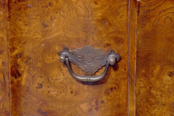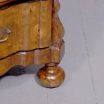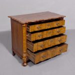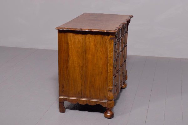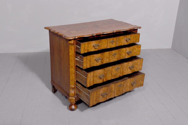 Circa 1820. Neat size burr elm Dutch shaped-front chest of drawers, featuring a burr elm top withholder crenelated fore-edges, positioned above four shaped-front drawers. The drawers have engraved brass handles and escutcheons, and solid oak linings. The chest with canted sides is supported on bun feet at the front and rear bracket feet. Lovely mellow colour and excellent patina.