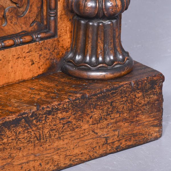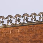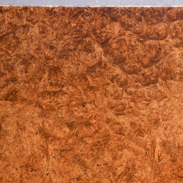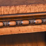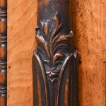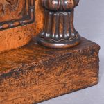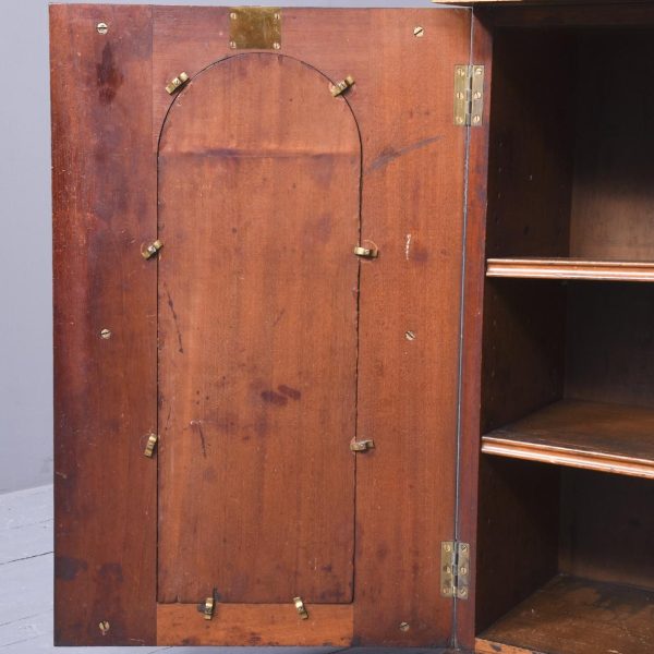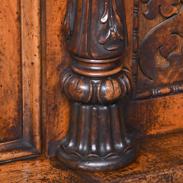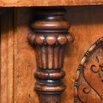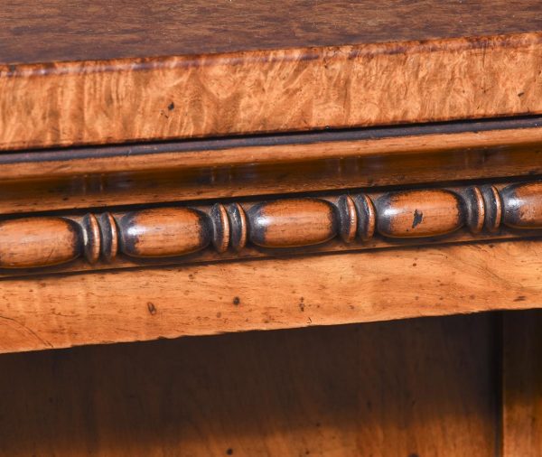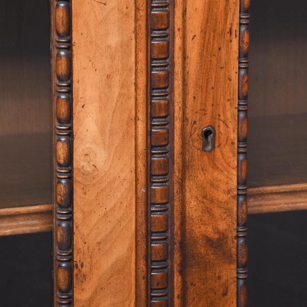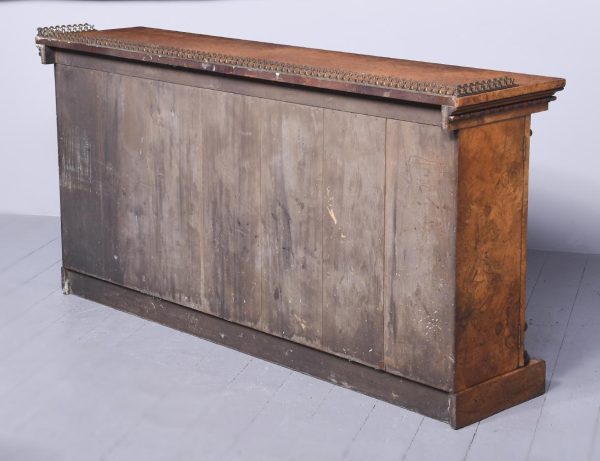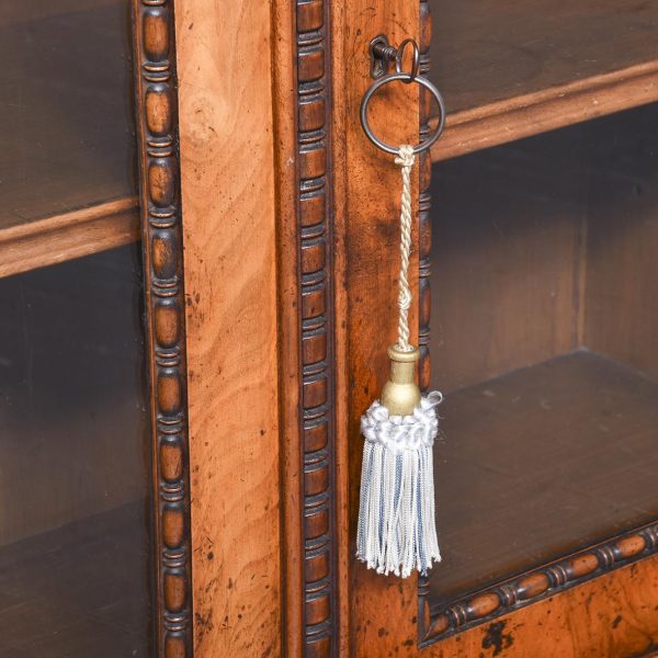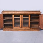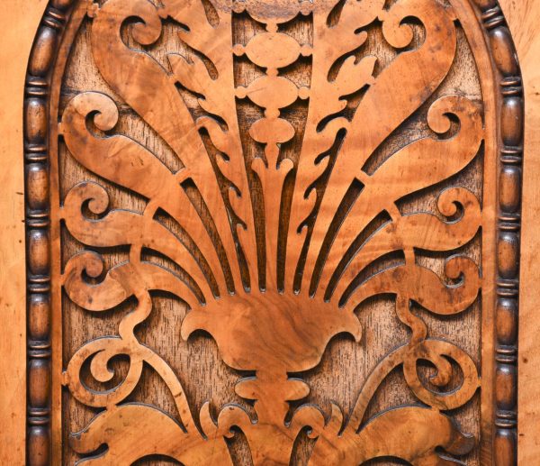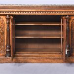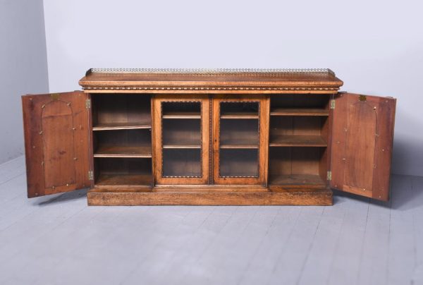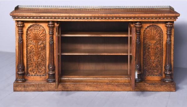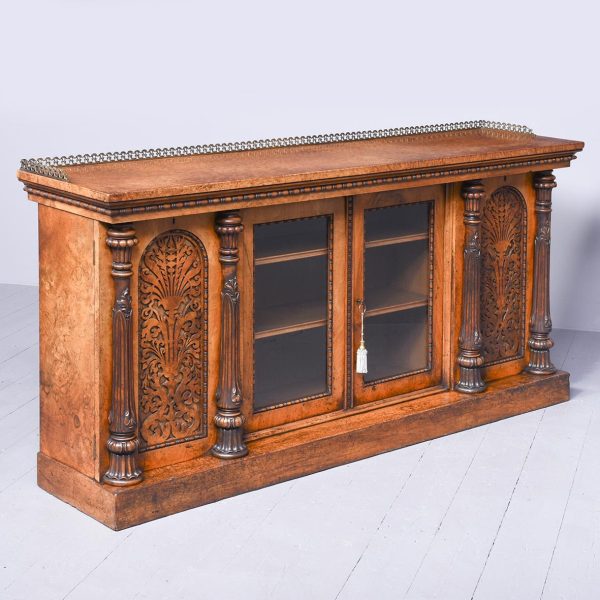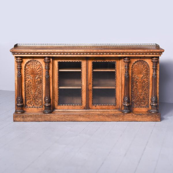 Circa 1840. An early Victorian Exhibition quality burr walnut and amboyna credenza. The top with its finely figured amboyna, with a pierced ¾ gallery, simple fore edge with a fine egg and dart beading beneath. The cabinet has two pairs of doors on each flanked by carved and fluted columns, arched doors with pierced fretwork opening to a pair of shelves. In the center a pair of glazed doors with a fine beading similar to the foredge, with two adjustable shelves. The whole piece rests on a large deep enclosed plinth which protrudes past the four columns at the front. Great colour and patination.
