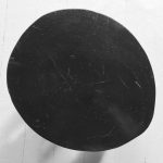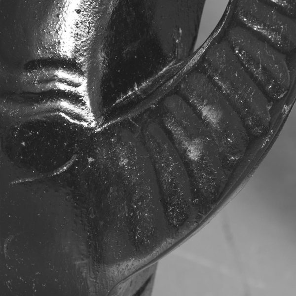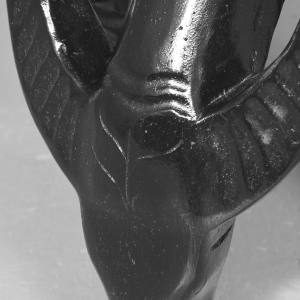 Circa 1920’s. An unusual and stylish African occasional table, the thick almost circular top made from a cross section of a tree, supported on three solid legs in the form of a water buffalo heads with a pierced section where the horns connect to the underside of the table, all ebonized.