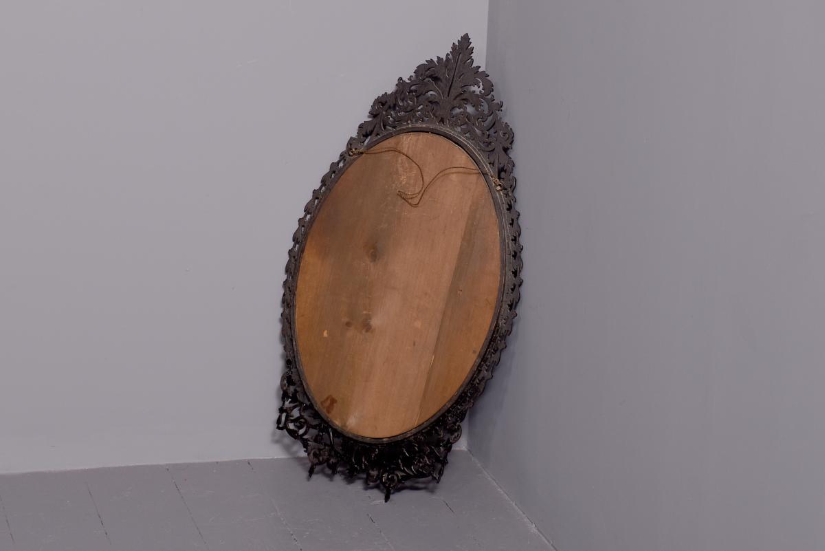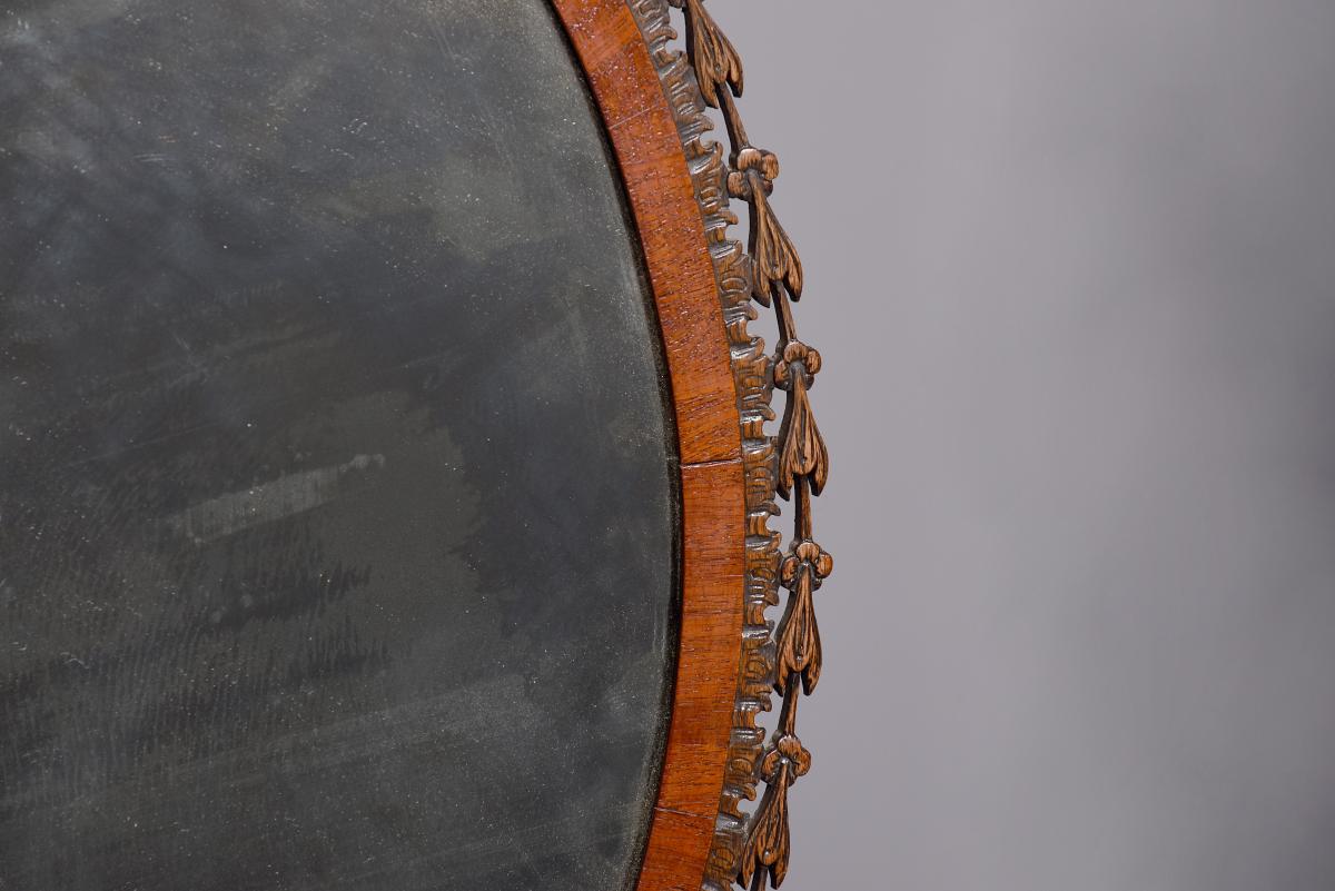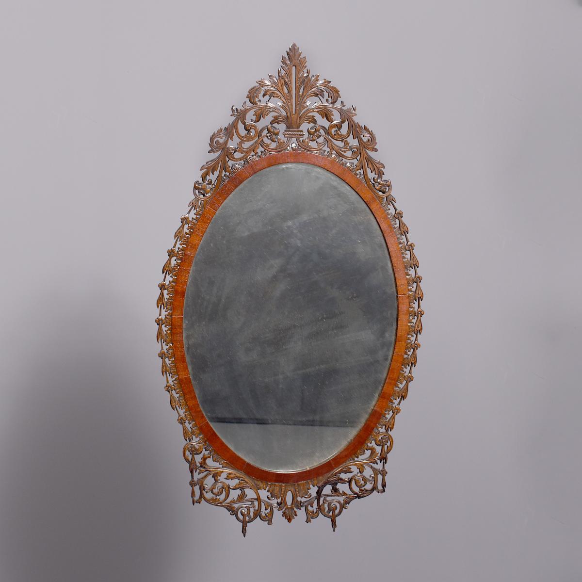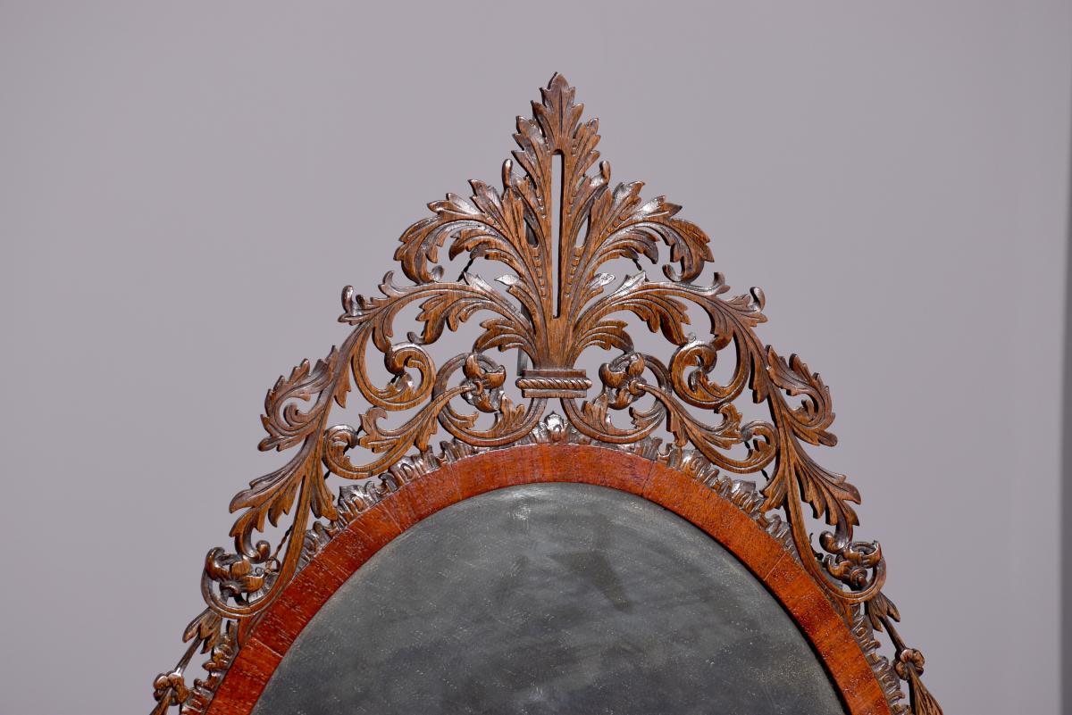 Circa 1900. Carved and fretted mahogany Georgian style wall mirror. The finely carved and fretted mirror frame with acanthus leaves on top, and bellflower chains on the sides and further acanthus open carving to the base. The original mirror plate in a very good condition.