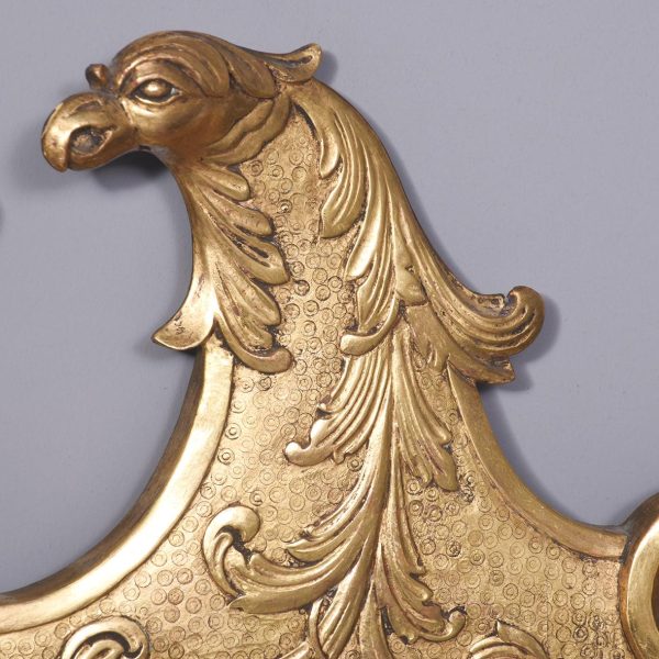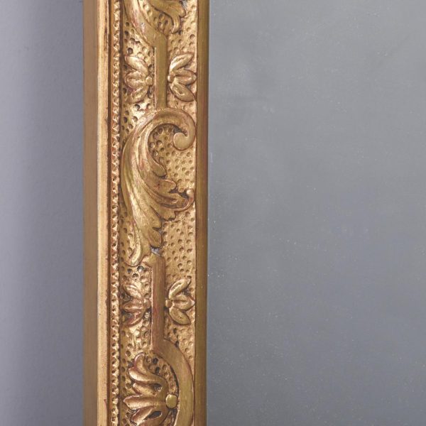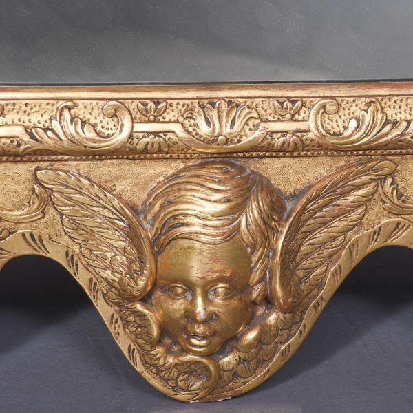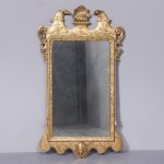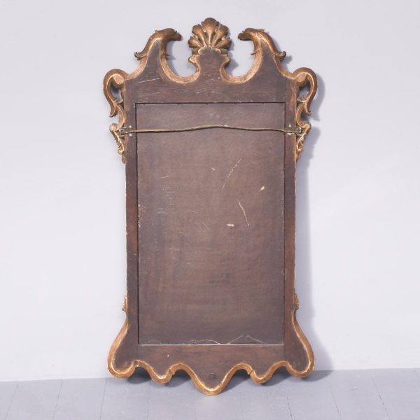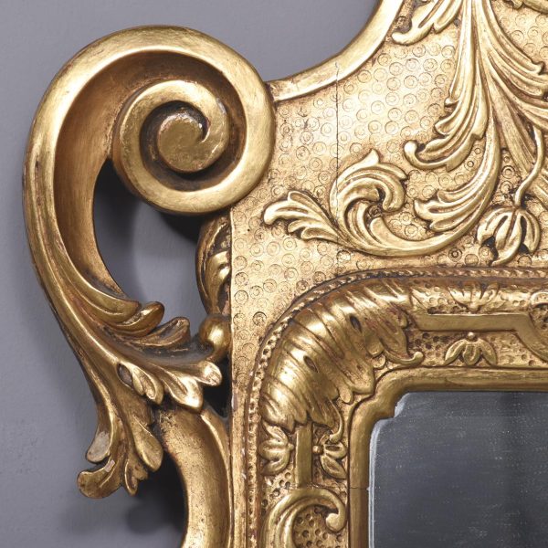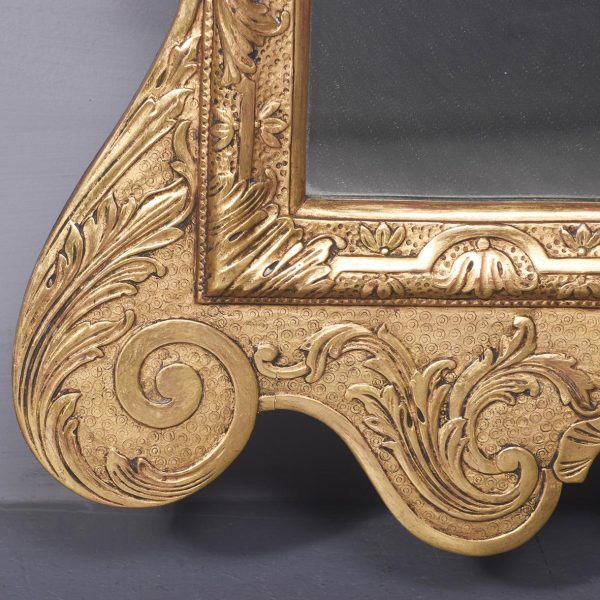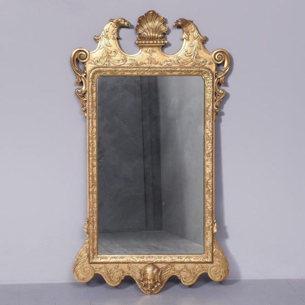Circa 1900. A carved gilded George I style mirror in the manner of ‘James Moore’. The top surmounted by an elegant scalloped shaped floral section flanked by two mythical birds, the gilded frame with classic Moore foliate carved gilded gesso. The mirror held in place by a stylish slip with pierced scrolling to the sides, the bottom with a carved cherub head, flanked by a pair of wings and the shaped sides and bottom gilded carved gesso. In excellent condition with great colour, style and patination.