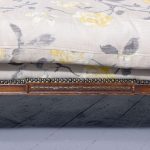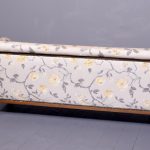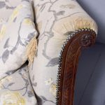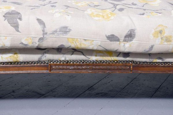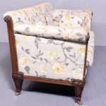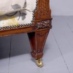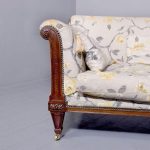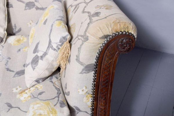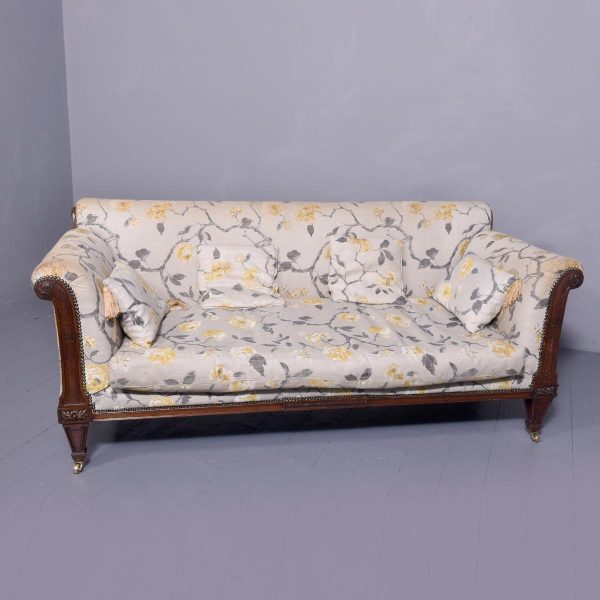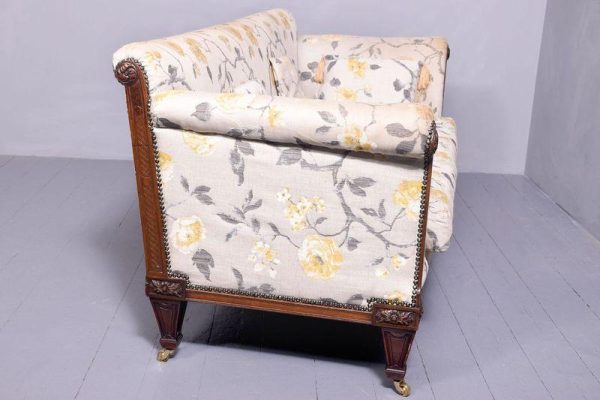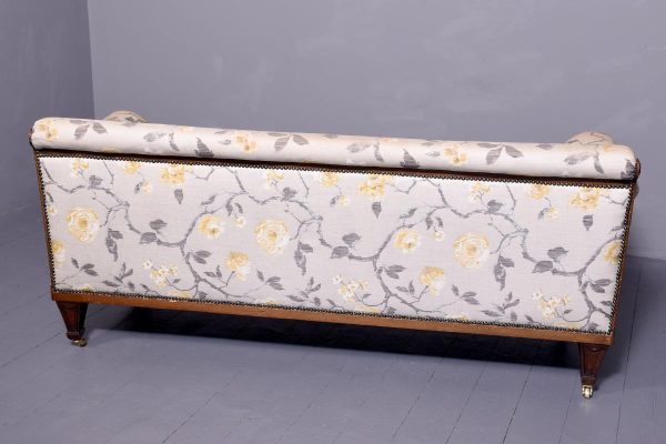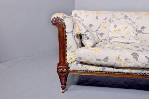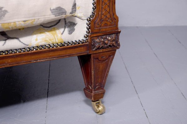 Circa 1890. A quality mahogany framed 3-seater sofa, the back with a rounded shoulder and carved frame down the front and sides headed by a stylish rondel of a flower-head, the arms, seat and a removeable squab cushion all upholstered and finished with close brass studding, the seat rail with a small carved tablet in the center all resting on four stout square tapering legs with inside carving on the facing finishing on the original brass castors.