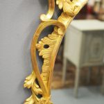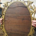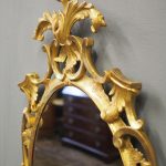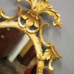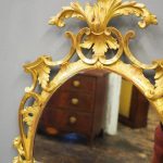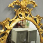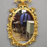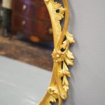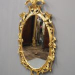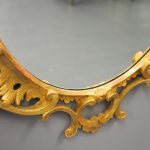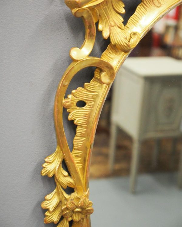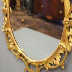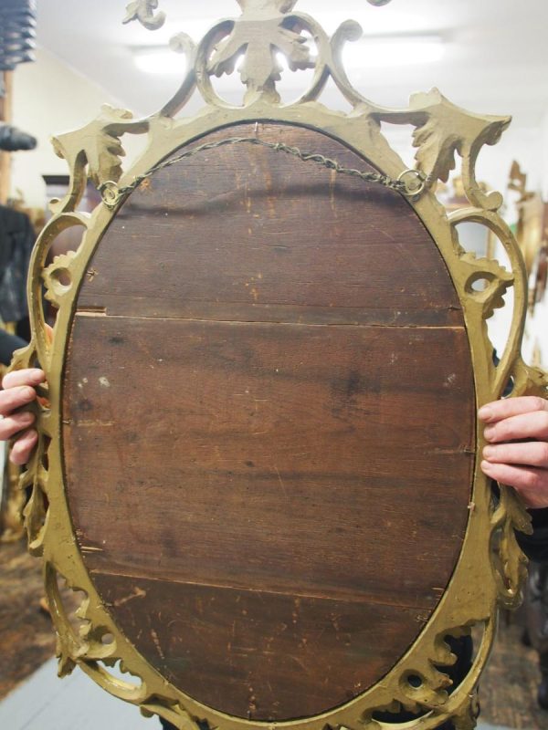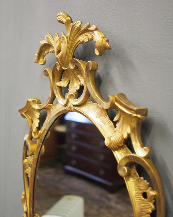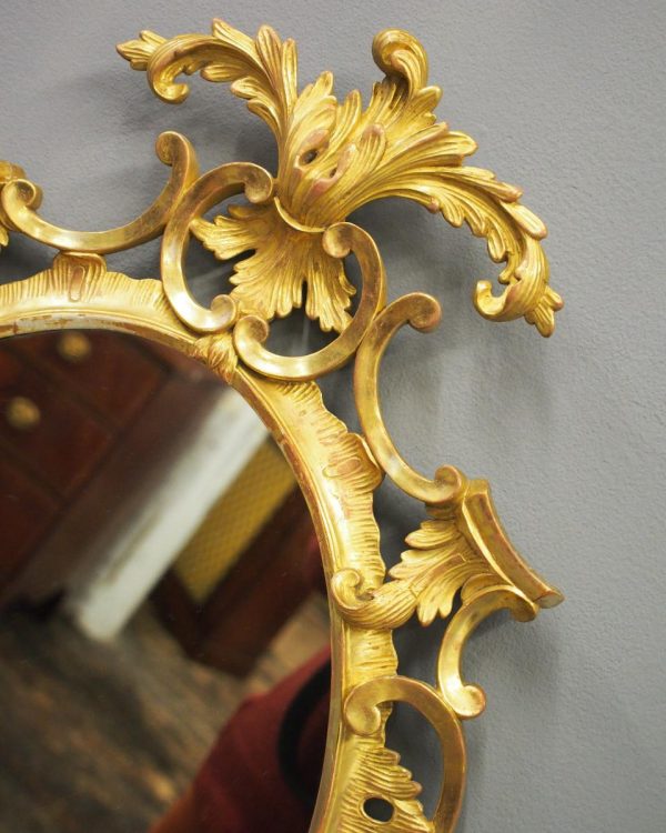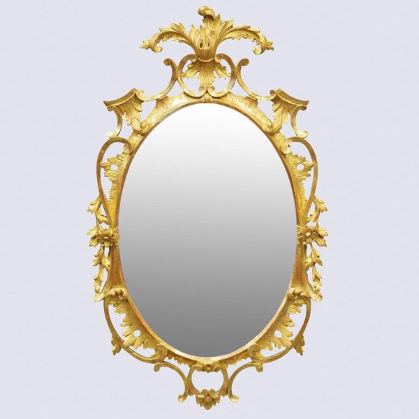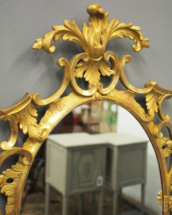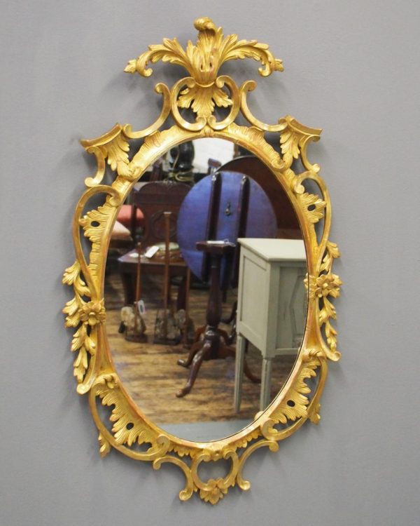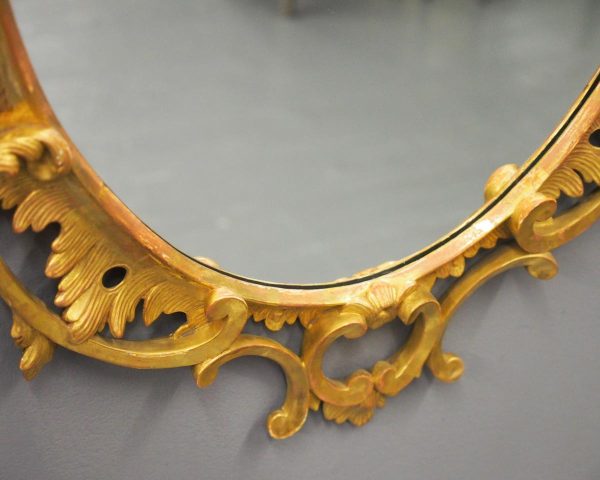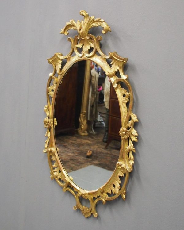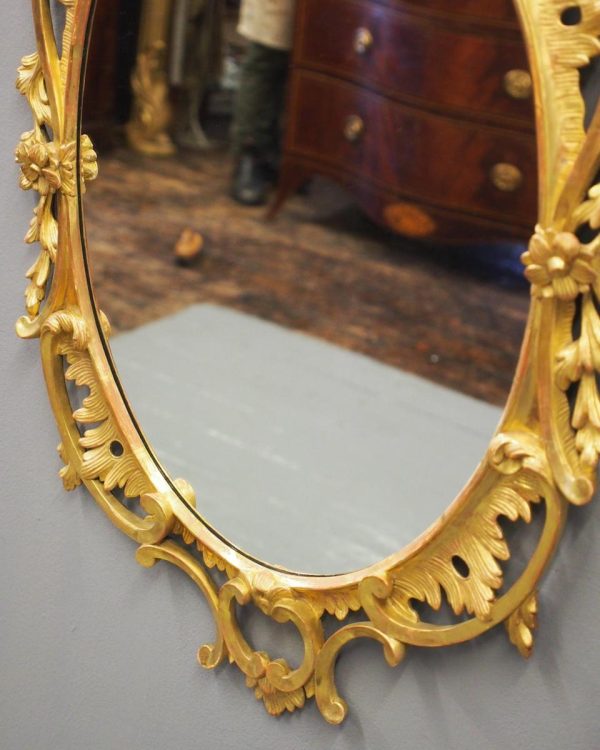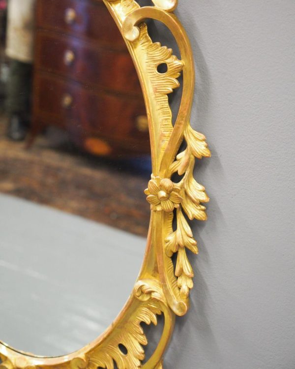 Circa 1950s, a carved giltwood mirror in the style of Robert Adam. The oval-shaped mirror is surmounted by a spray of foliate carving held in place by c-scroll brackets. These occur continually around the frame and from the top to bottom. Entwined with further foliate carving and flower heads. At the base there is a double loop with foliate carving.