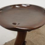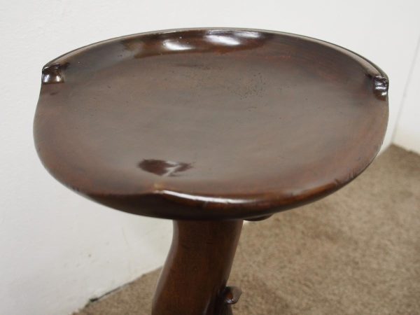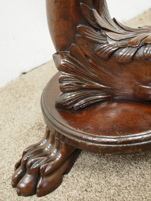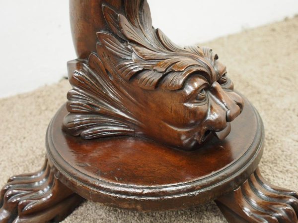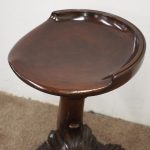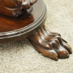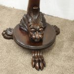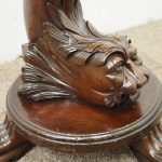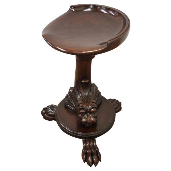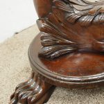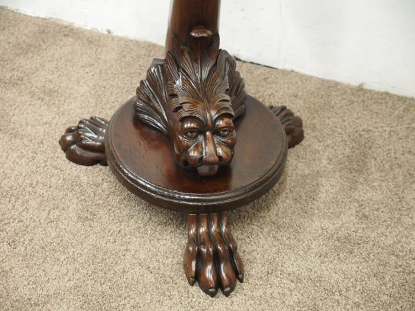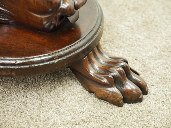 Circa 1870, carved mahogany revolving grotto stool, with the trade label of Edwards and Roberts, London. With a scooped out seat in solid mahogany and small gallery back which is fixed to a thread revolving mechanism. It has a tapering column, carved acanthus leaves on the base and a mythical lion mask. Sitting on a round platform over three lions claw feet; the castors have been removed and with a central trade label of Edwards and Roberts.