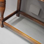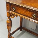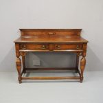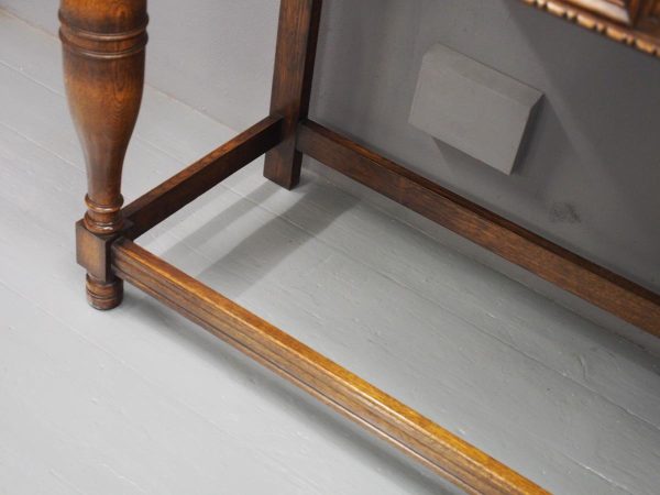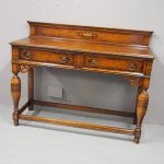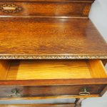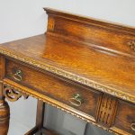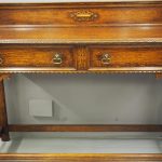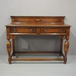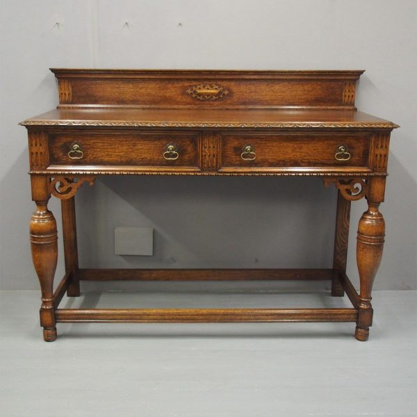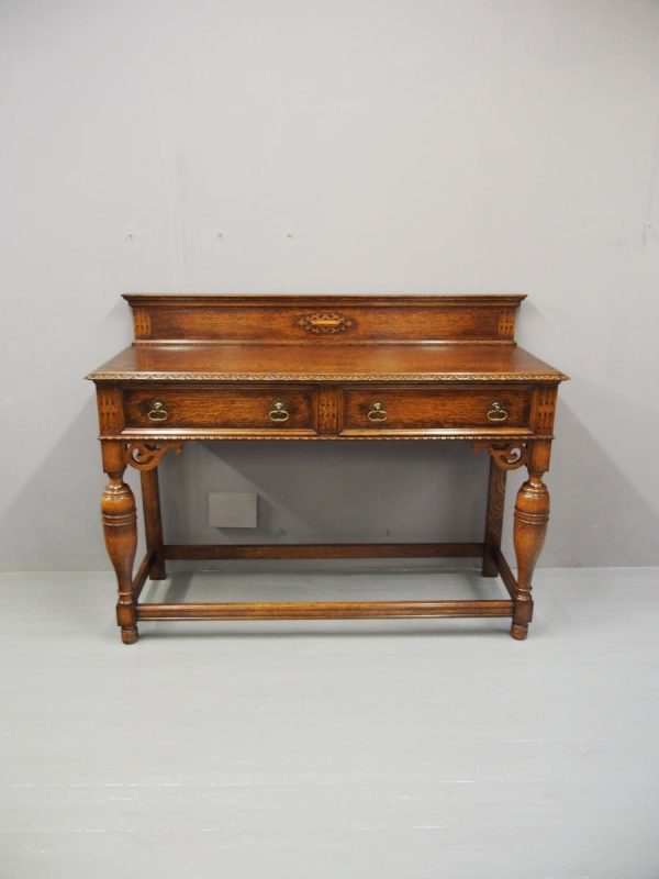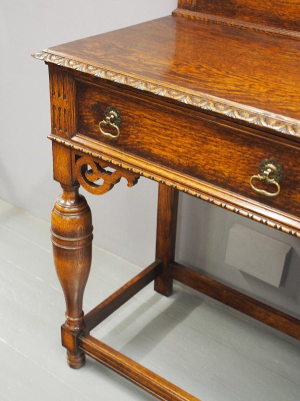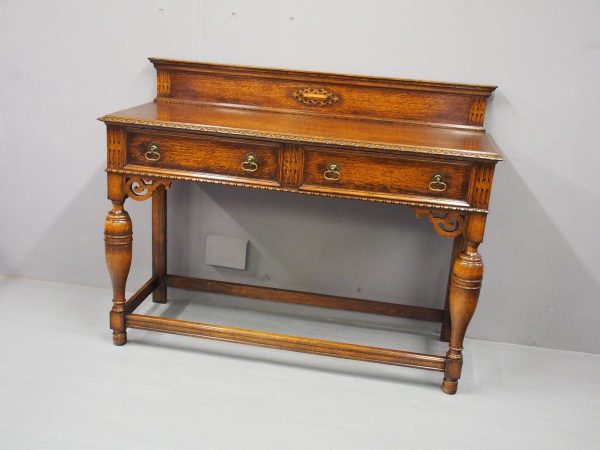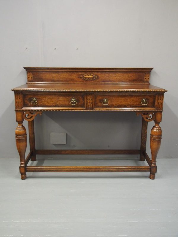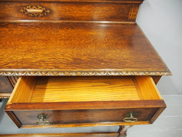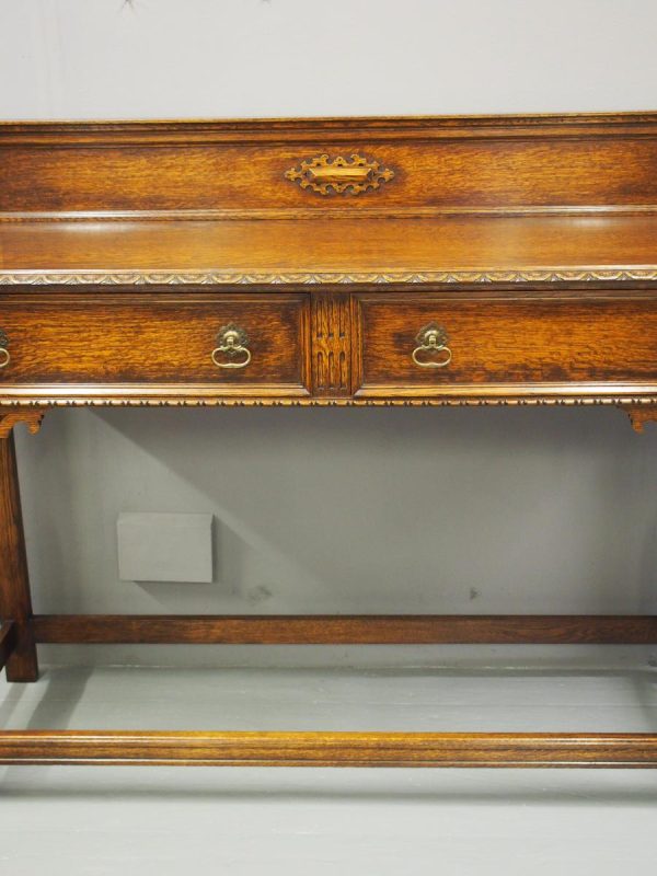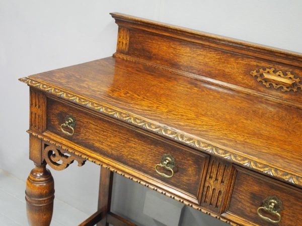 Circa 1900, carved oak buffet. The rectangular shaped top has a carved upright, with well carved fore-edge and is above 2 large drawers with cast brass drop handles. With foliate open fretwork quarter brackets beneath, standing on rectangular back legs and bulbous, ring turned and tapering front legs. A stretcher provides further stability, with reeded facings.