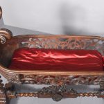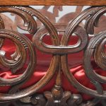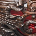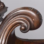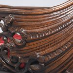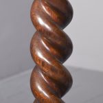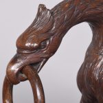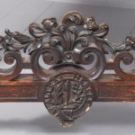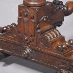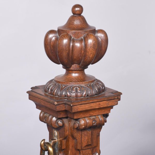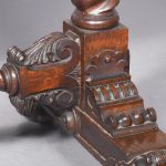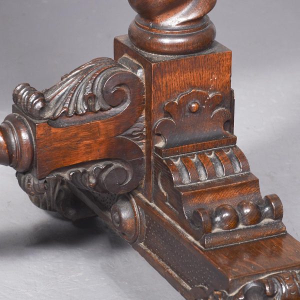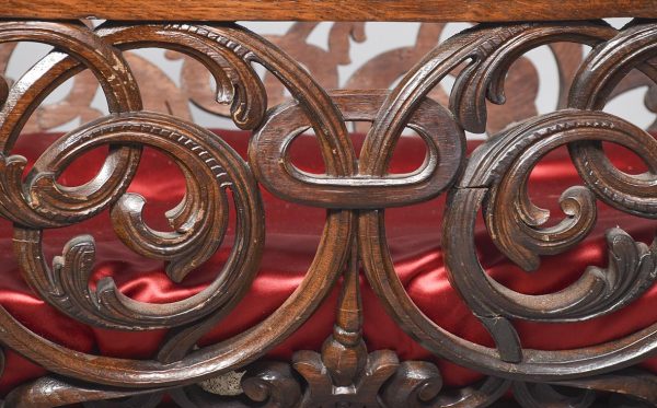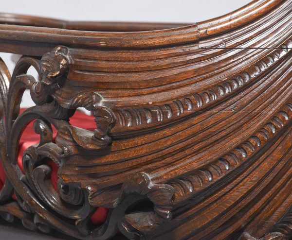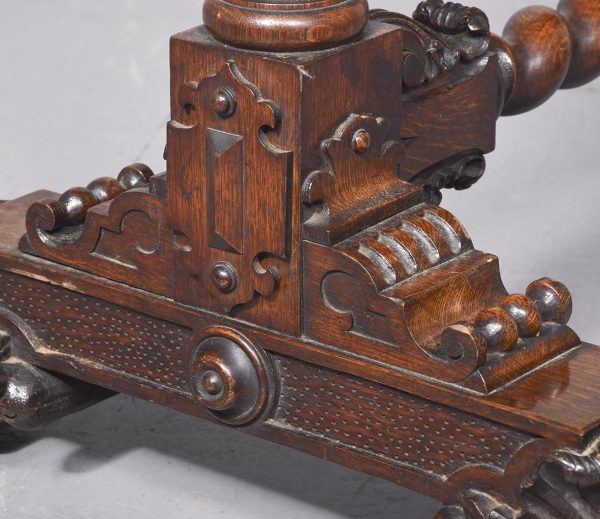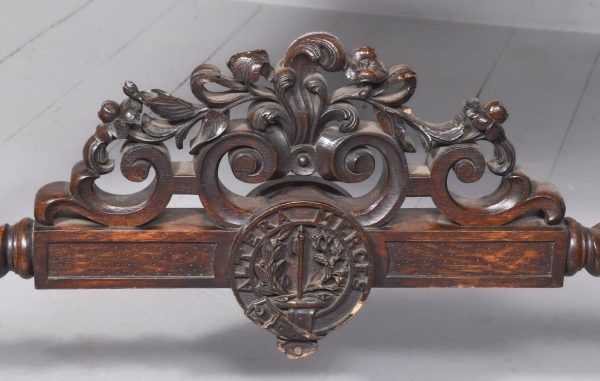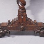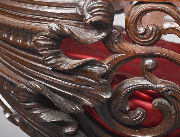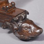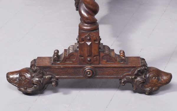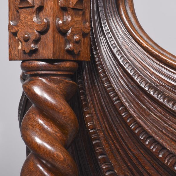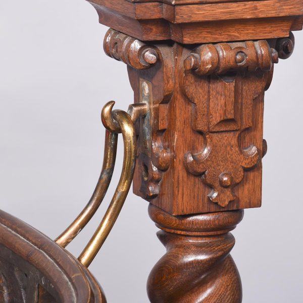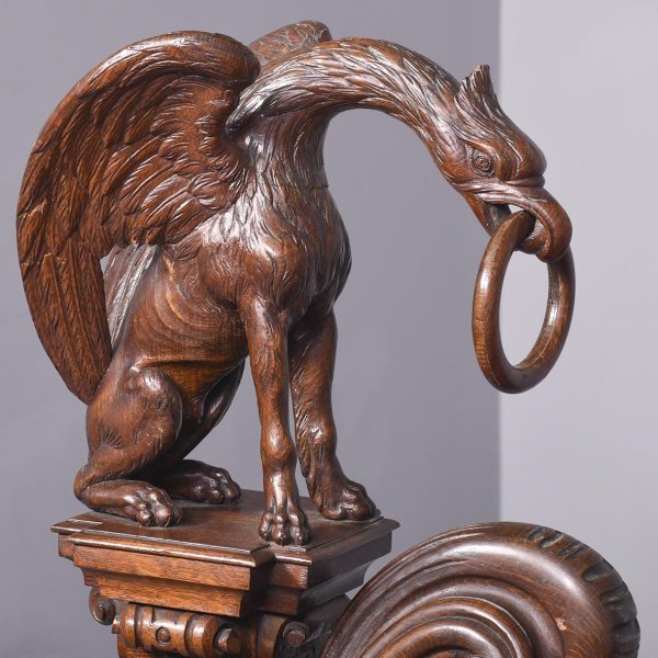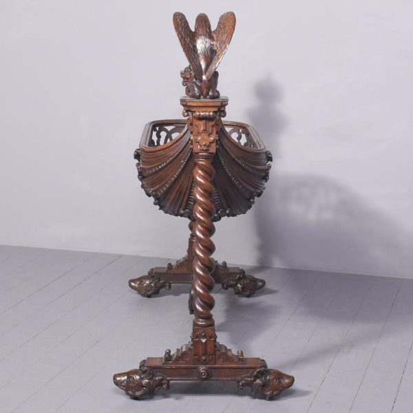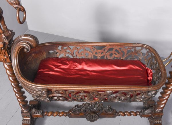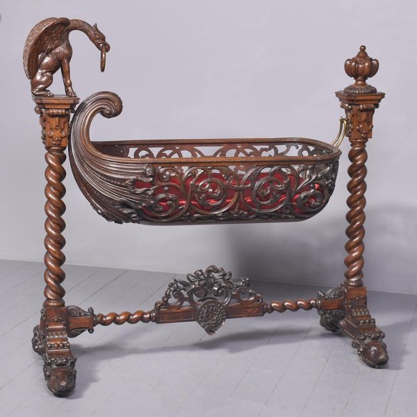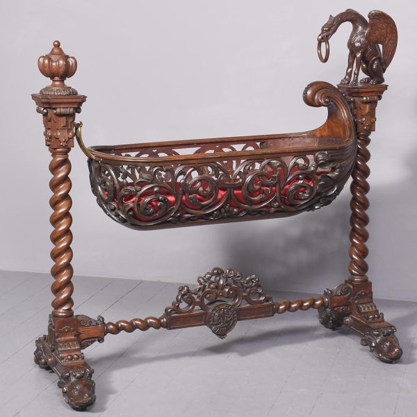 Circa 1850. An unusual stylish profusely carved oak cradle/crib. The boat shaped crib with pierced foliate carved sides, the solid end with a curvaceous section, held in place by brass clasps attached to two barley sugar uprights, one at the head is surmounted by a winged griffin holding a carved ring in its mouth, resting on top of the pedestal, the barley sugar columns rest on a platform base, braced by an elegant carved stretcher, with a coat of arms in the center and pierced foliate carving on the top, all supported on four carved animal heads with foliate carving to the sides. The crib and stand are in excellent condition.