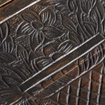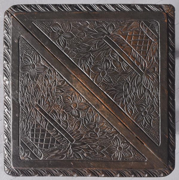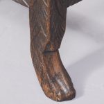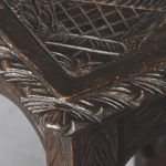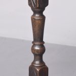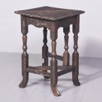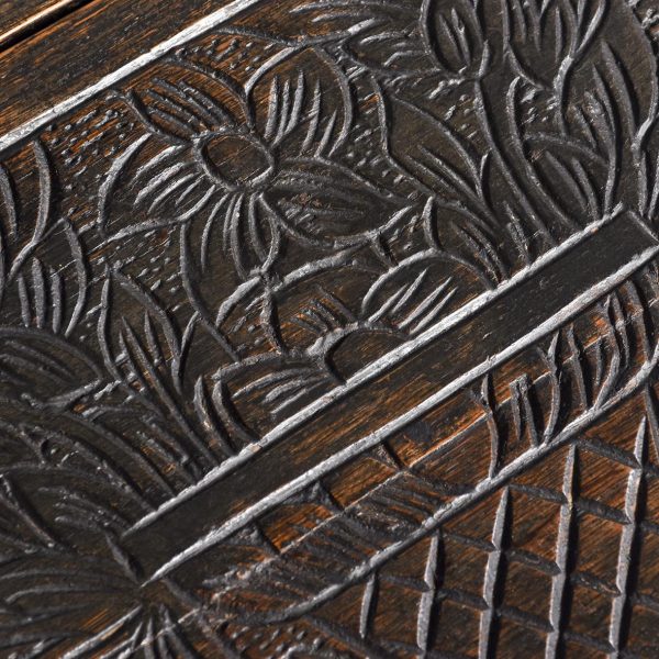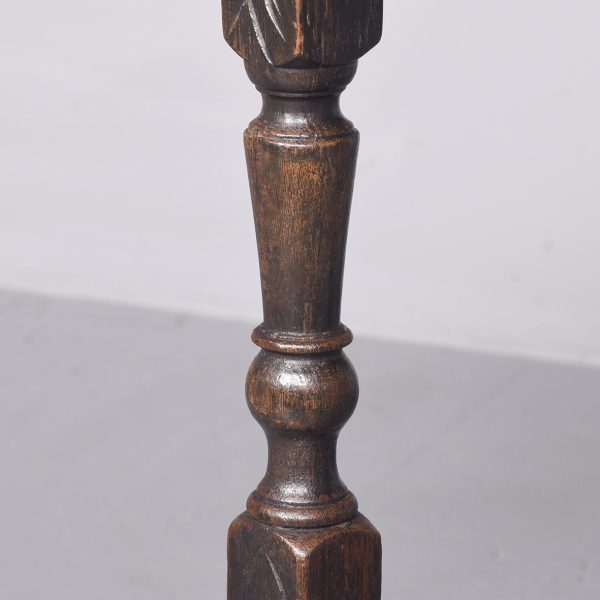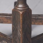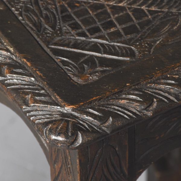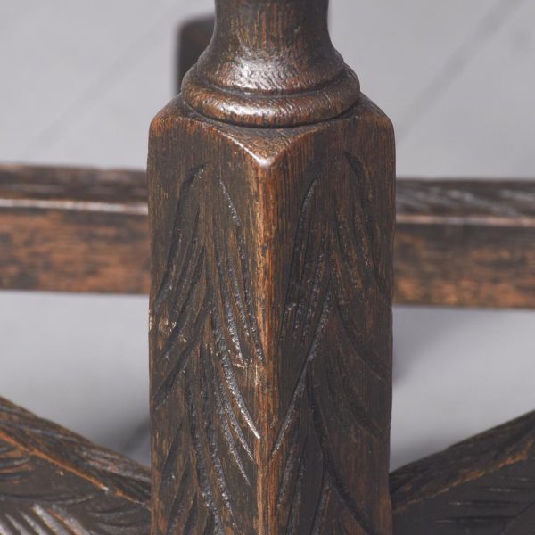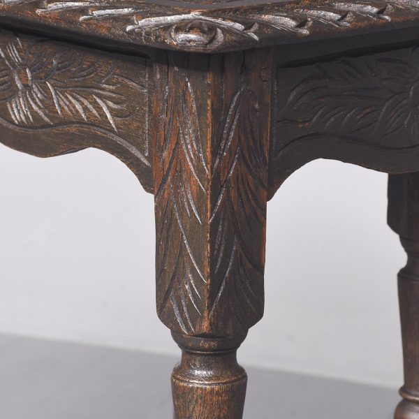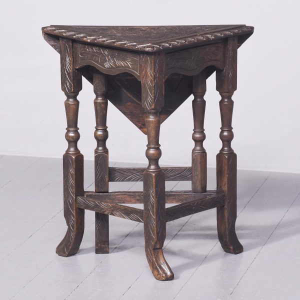 Circa 1880. Charles II style carved oak triangular shaped drop leaf table. The top with carved flowers and an urn with a dragooned fore-edge. The drop-leaf with similar carving, opens and held in place by a swinging leg, with a foliate carved shaped frieze, the table rests on four elegant carved legs, which are braced by carved stretchers and finished on an outward swept shaped foot.