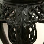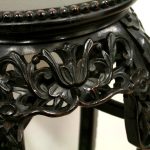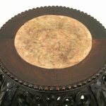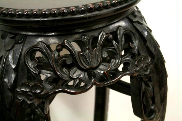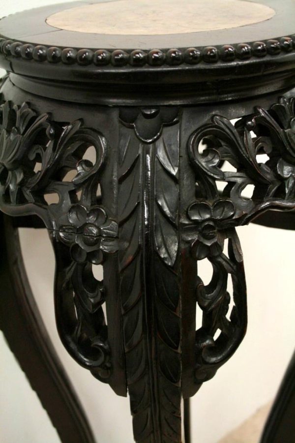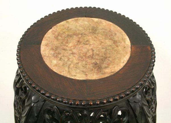 Circa 1900, carved rosewood Chinese stand. The circular top has a beaded edge and a variegated marble insert. Below is a pierced carved frieze of foliate design, and the stand is supported by four shaped legs on claw feet united by a carved cross stretcher.