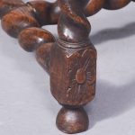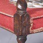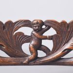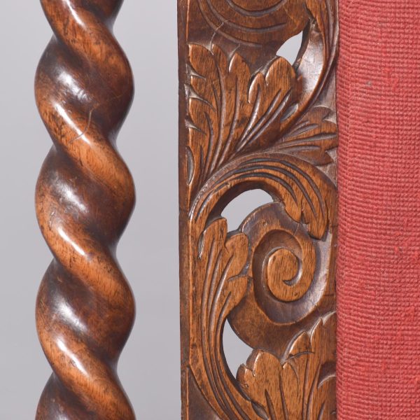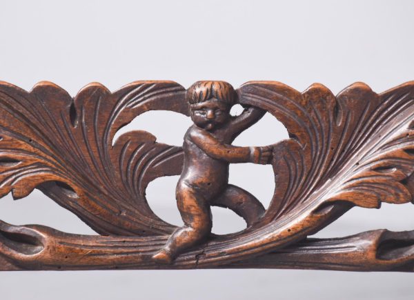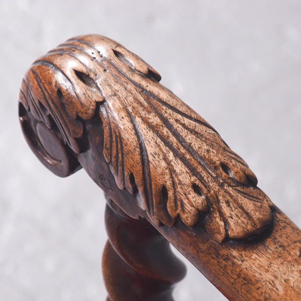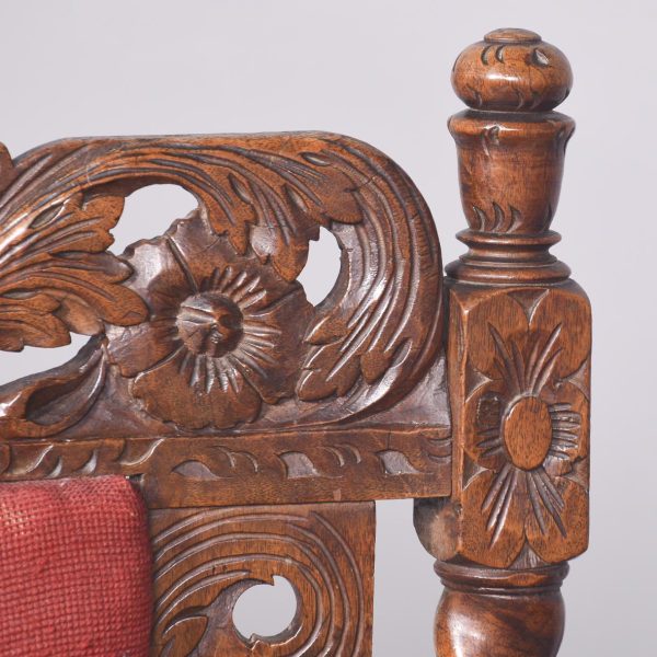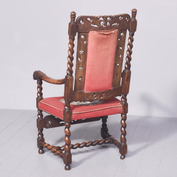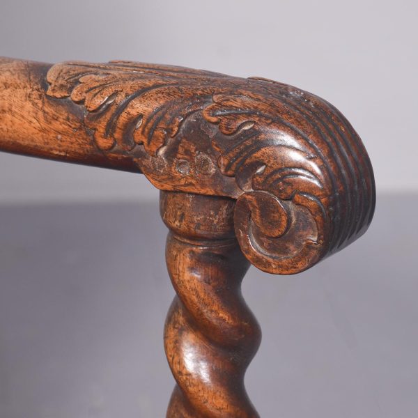Circa 1800 A quality carved walnut William & Mary style armchair, the carved and pierced cresting rail with a cherub, foliate carving and flower-heads, the uprights finishing with an elegant finial with a carved flower-head beneath, the padded back in beaded needlepoint flanked by pierced uprights, the carved arms finish with a curved section supported on barley sugar uprights, with a carved section similar to the top rail, with barley sugar legs, the fronts with carved flower heads intersected by barley sugar sections.