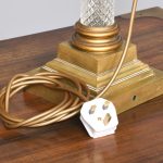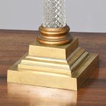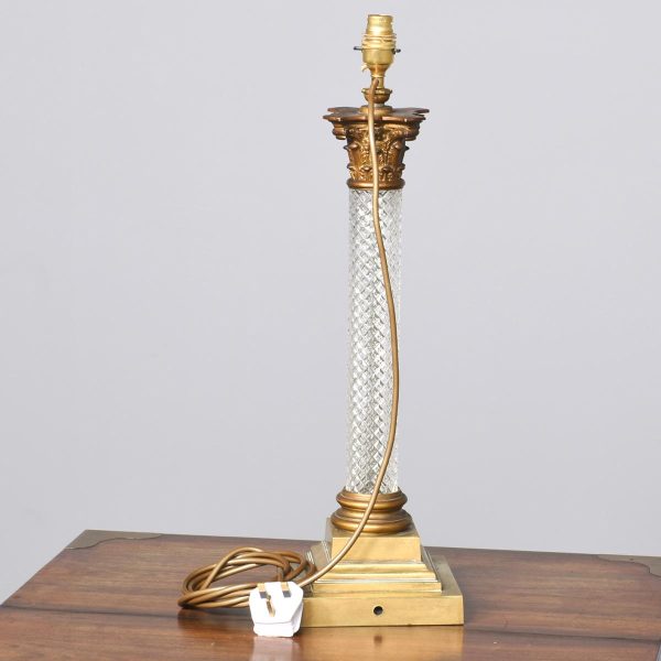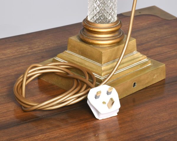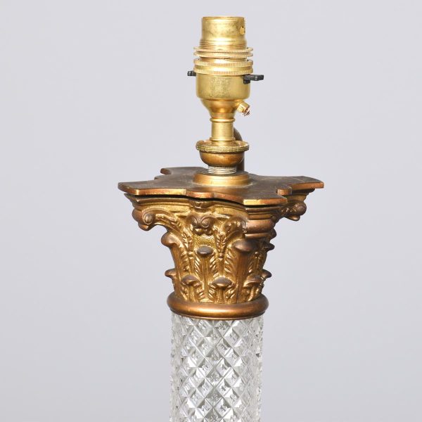 Circa 1890. An interesting cast brass and glass Corinthian lamp (converted from an oil lamp) top with lamp holder fitted to the classic gilded brass Corinthian capital with glass column, with a diamond pattern. The whole piece is resting on a stepped square platform base with a mixture of brass and gilding.