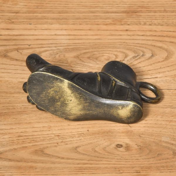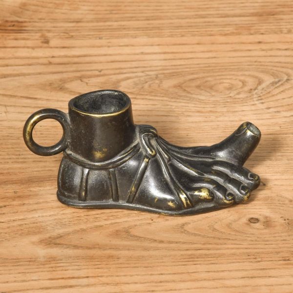 Circa 1900.  An interesting neat sized, Grand Tour style, cast bronze oil lamp in the form of a foot, resting in an open sandal. One raised toe has a small aperture, as has the ankle, with a small lifting handle at the rear.