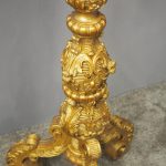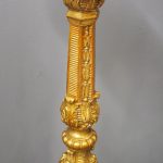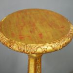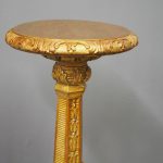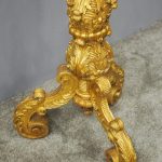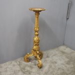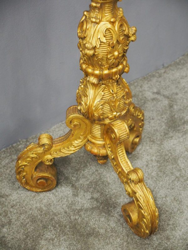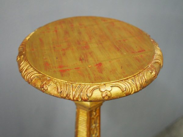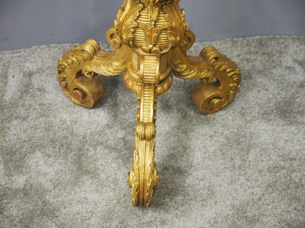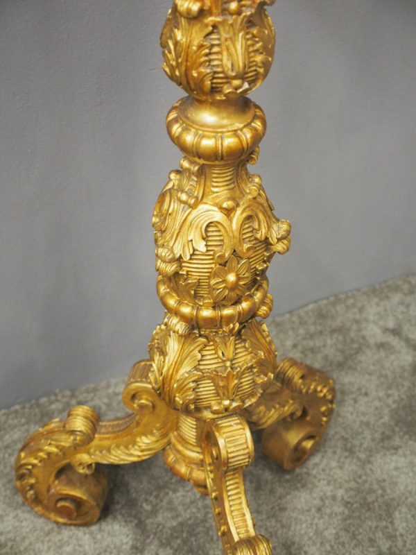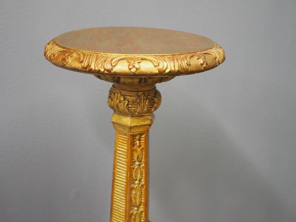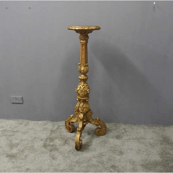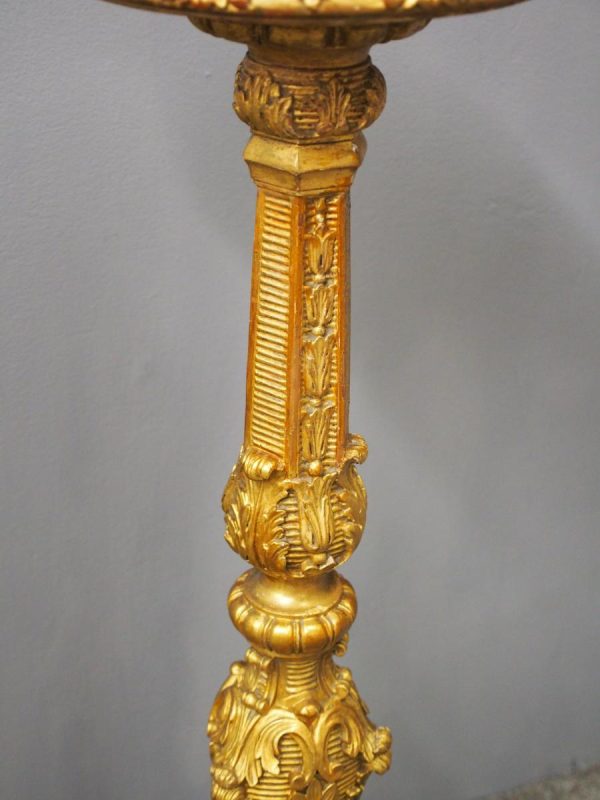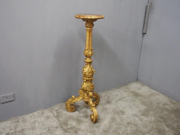 Circa 1880, Charles II style carved and gilded torchere. The profusely carved stand has foliated designs to the top, and a variation of acanthus leaves and ribbing continuing down. It finishes on well carved cabriole legs, which are adorned with C scrolls, ribbing and foliate designs, before finishing on a curved foot.