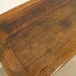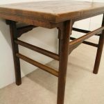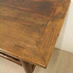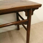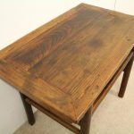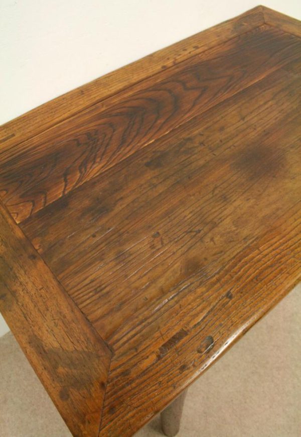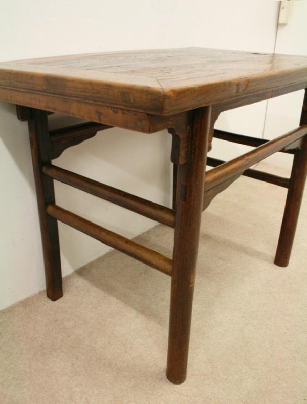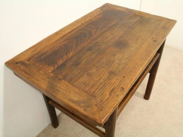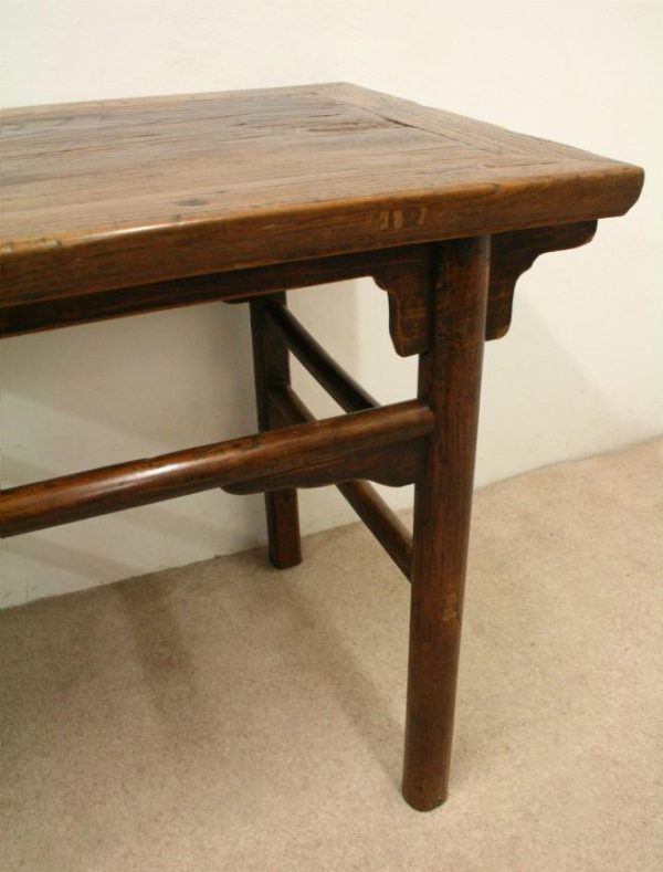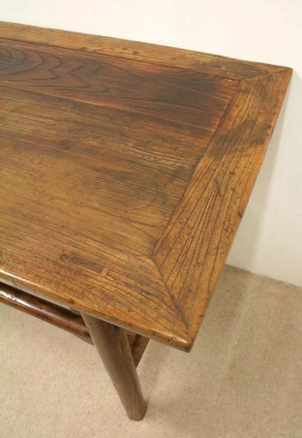 Circa 1900, Chinese elm altar table. The scrubbed top has wonderful graining and a framed centre section. Beneath the top is a simple apron in the classic Chinese taste. The whole piece stands on four large turned legs united by a double stretcher on each side and a single stretcher on the front. The table has great colour and patination. Very stylish, would make a good serving table or side table.