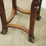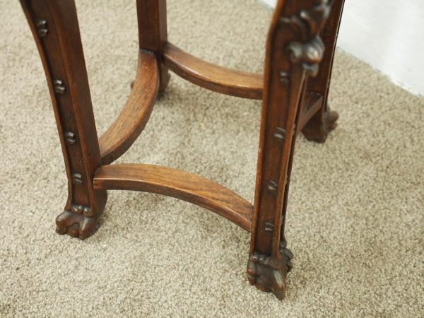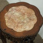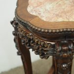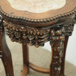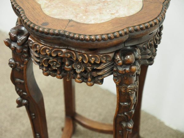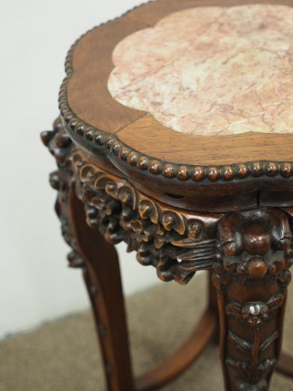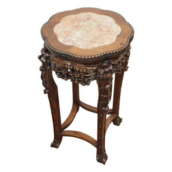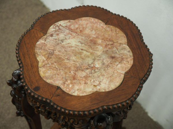 Circa 1890, Qing dynasty, Chinese hongmu and marble top plant stand. With flower shaped top, pink variegated marble inset and a Chinese beaded fore-edge, sitting above a shaped, open fretwork apron. It has an elaborated carved pattern of bell drops, flowers and vines, and leads on to the mythical dragons to the top of the legs. There is a pattern of flowers running down the legs, and between them are concave stretchers, finishing on an animalistic foot.