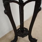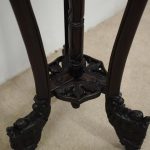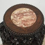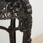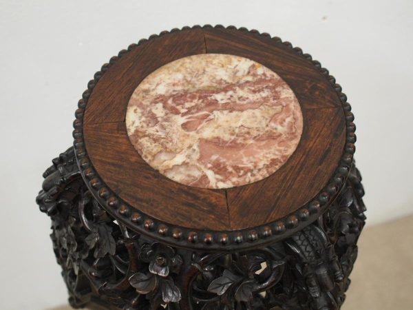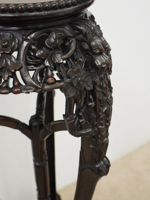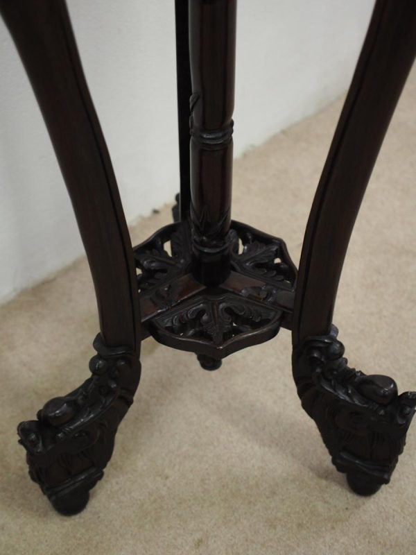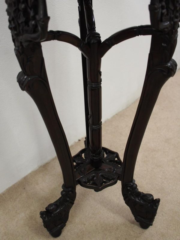 Circa 1900, Chinese hongmu marble top plant stand. The top fore-edge has full relief beading, with a carved apron and an unusual 3 legs with carved dragon heads and open fretwork to the quarter blocks. There are 3 faux bamboo legs leading on to the central stem (also faux bamboo), with a small shelf and finishing on carved dragon design bun feet.