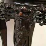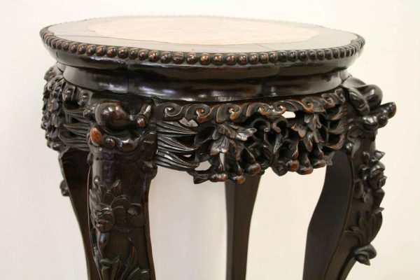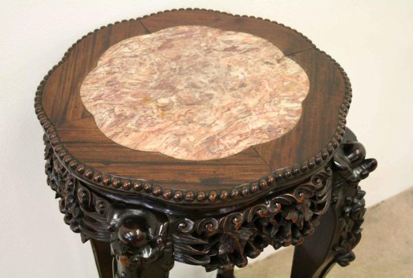 Circa 1900, large sized Chinese hongmu plant stand. The shaped top with pink variegated marble insert, surrounded by a segmented edge with a beading and concave section beneath this. The apron is profusely carved with a stylish pattern on the top and flowers and fruit below. All stands on 4 carved legs with Chinese figures at the top and foliate carving down the front, united by a cross over stretcher with Rococo style carving and a carved roundel in the centre, and finishing on stylised ball and claw feet.