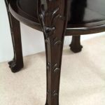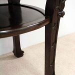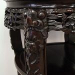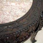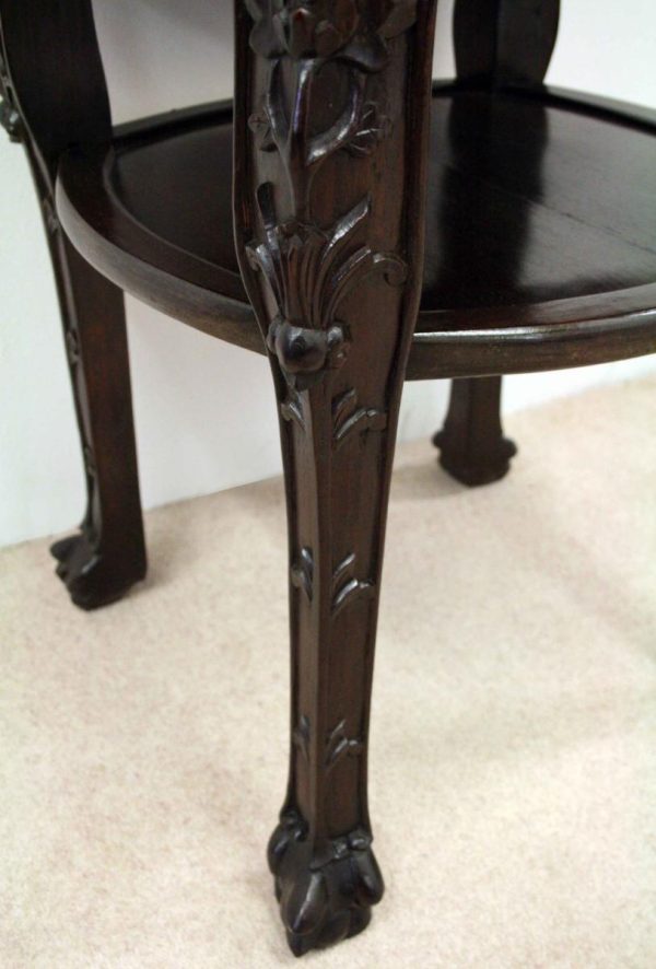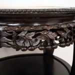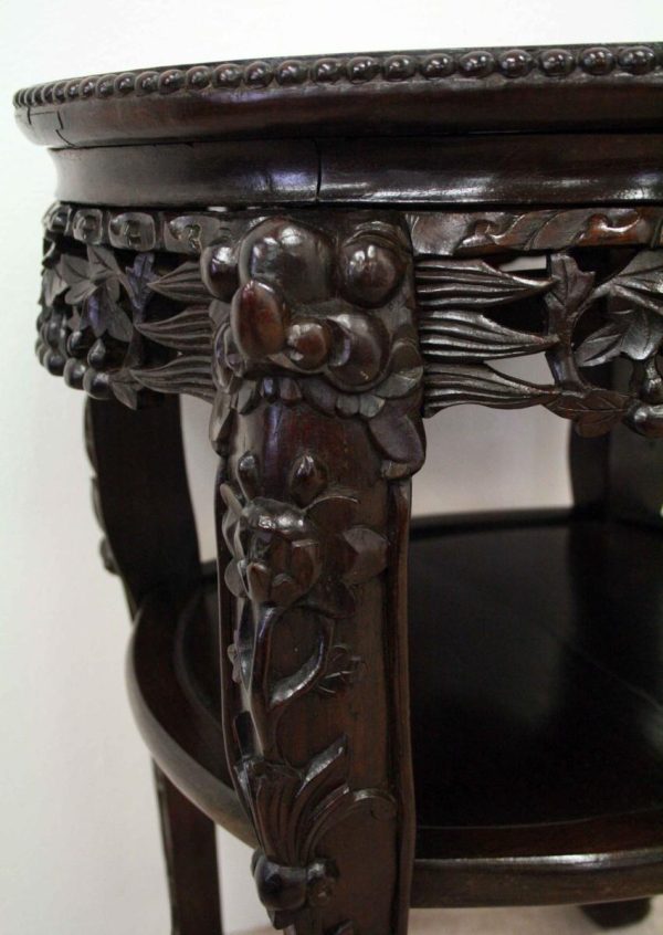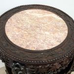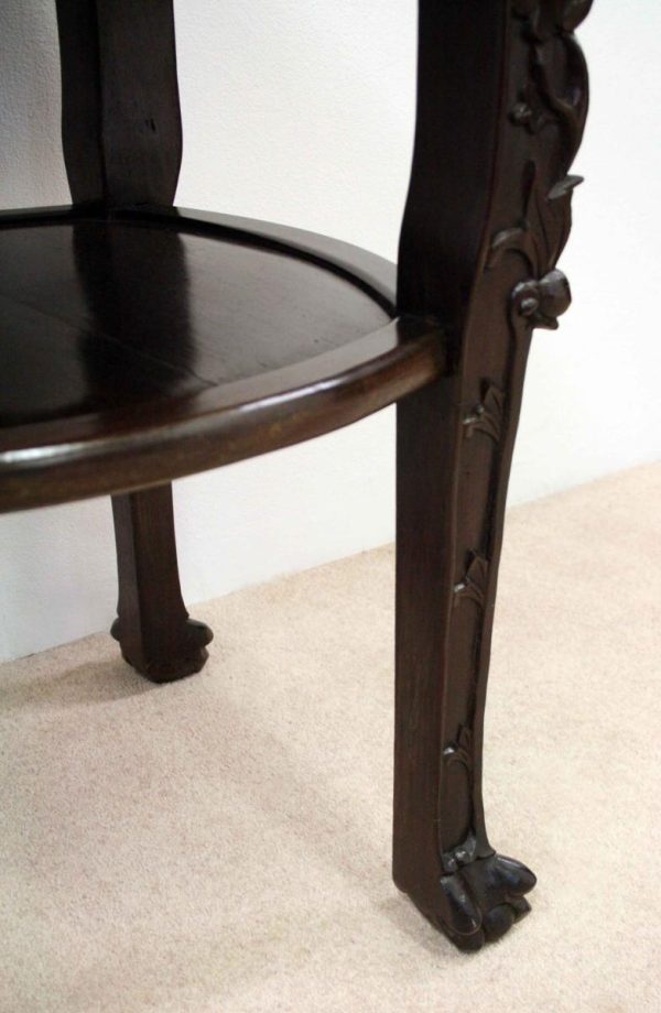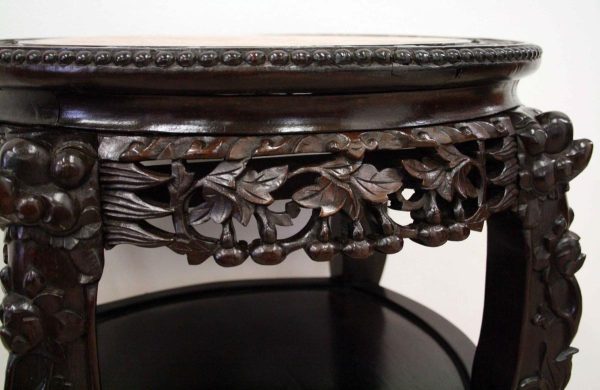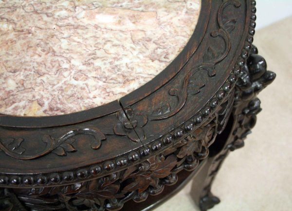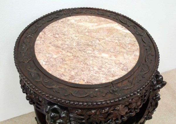 Circa 1880, large Chinese marble top plant stand. The circular stand has a red variegated marble centre surrounded by a broad carved foliate border and a beaded edge. Below this is a concave apron with open fretwork with foliate carving, over an under shelf, and all standing on four heavily carved legs with lion faces at the top and finishing on ball and claw feet. Sturdy and excellent colour.