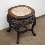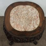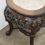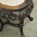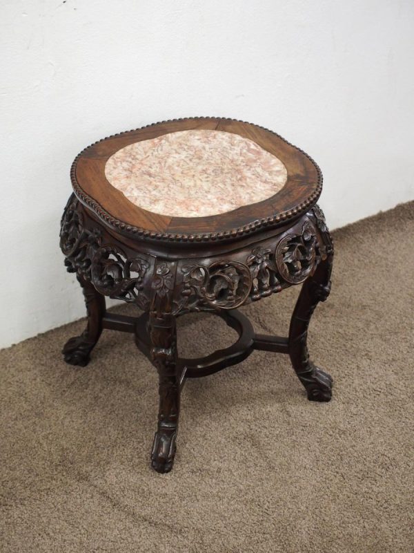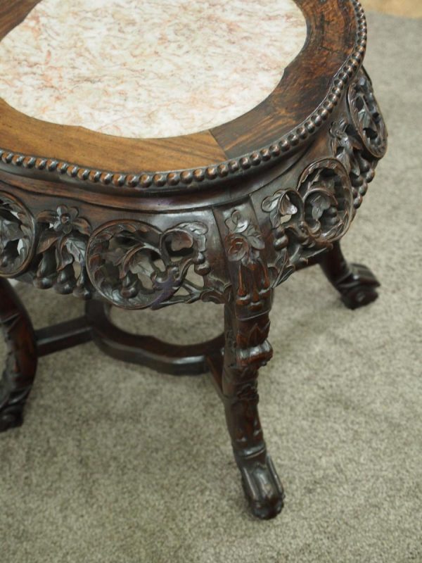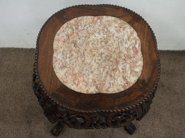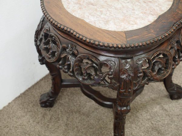 Circa 1880, low Chinese Rosewood plantstand. The shaped, circular top has a beaded rim and shaped pink variegated marble inset over a beautiful shaped and pierced, floral carved frieze. There are foliate carved cabriole legs with dragon head feet, each connected by stretchers to a central, internal, shaped stretcher.