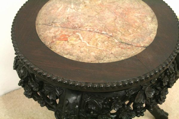 Qing dynasty Chinese rosewood plant stand, with a variegated pink marble top and beaded fore edge, over an exceptional quality carved open fretwork bulbous frieze with foliate carving of cherry blossom and vines, standing on foliate carved cabriole supports with carved stretchers.
