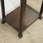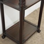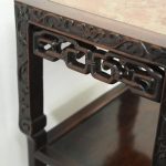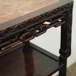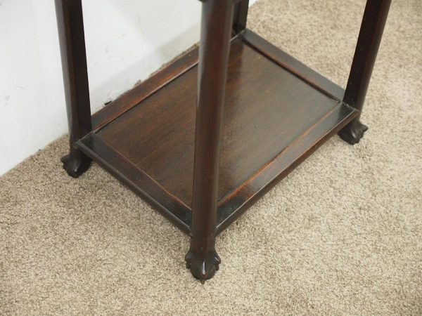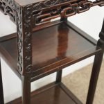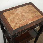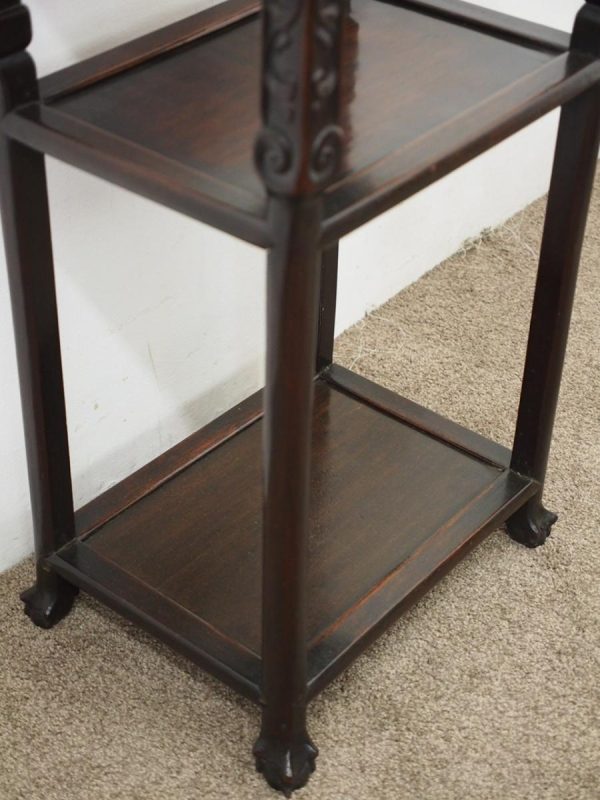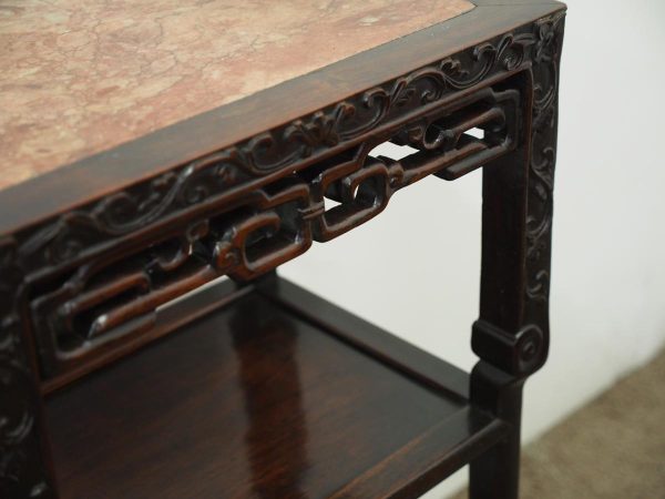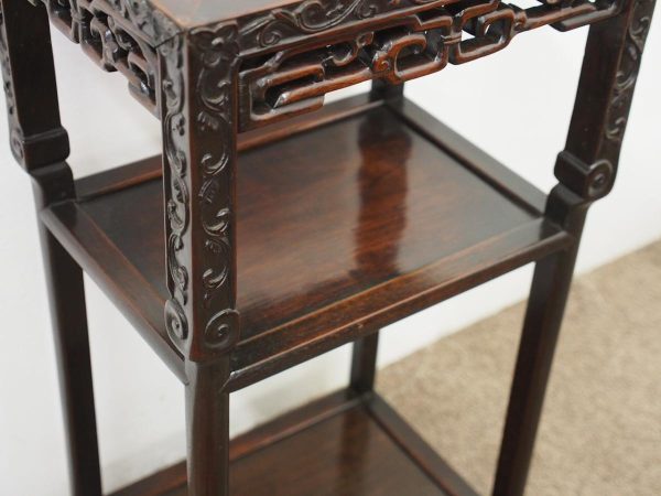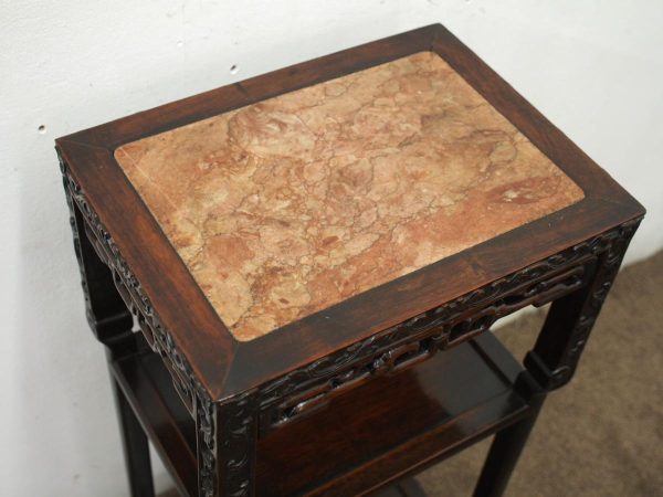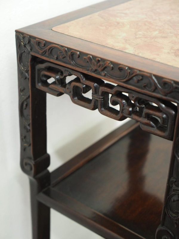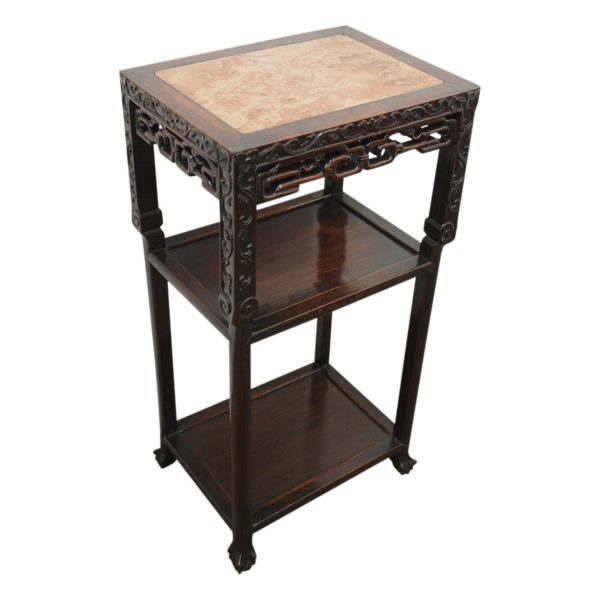 Circa 1890, Chinese three tiered stand with pink variegated marble insert in the top. With foliate carving to the fore-edge and top of the legs with scrolling flowers and flower heads which continues down the front and sides. There is a wraparound gallery and typical Chinese open fretwork. Beneath the top is two further tiers with their recessed solid insert. As the legs continue down they finish with an animalistic foot.