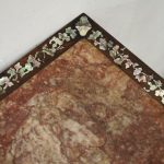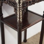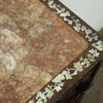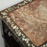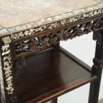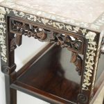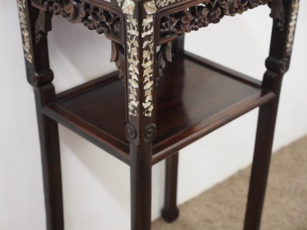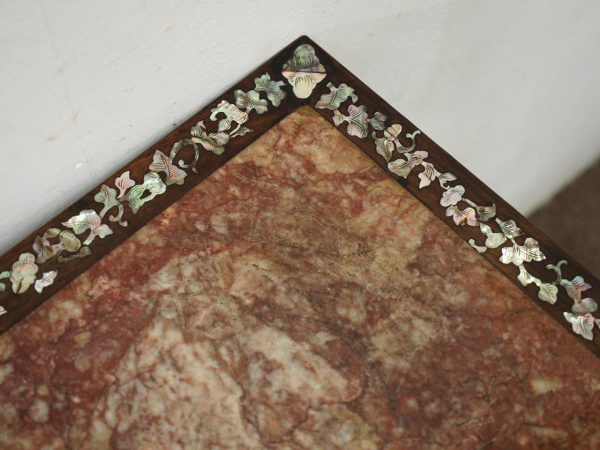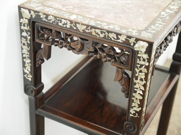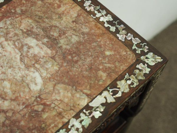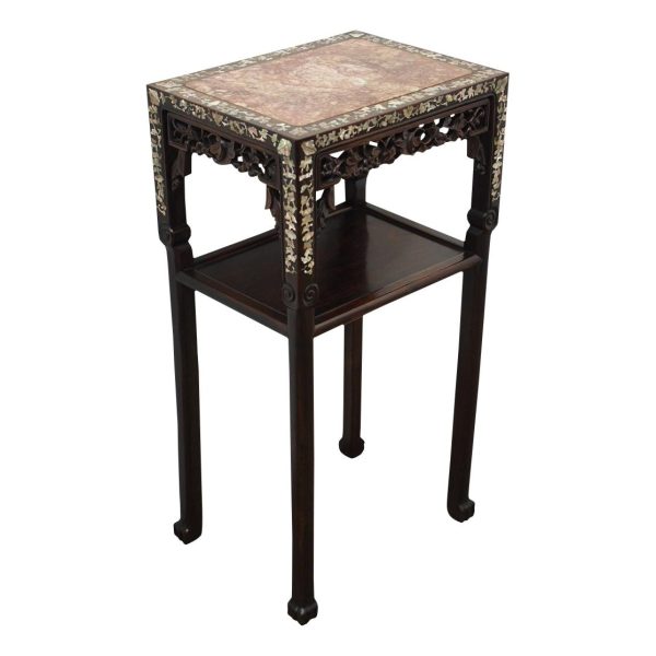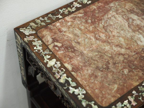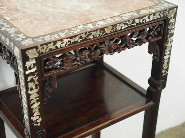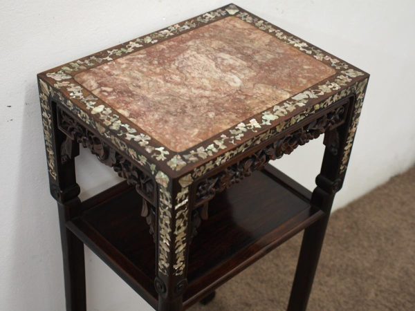 Circa 1890, Qing dynasty pink variegated marble two tiered Chinese stand in hongmu wood. With rectangular top and marble insert with profuse mother of pearl inlay on the top and sides. Beneath the apron is a simple beading and beneath this open fretwork which continues down into the quarter brackets. As the legs continue down towards the first tier there are c scrolls and a breakfront section and the second tier is in solid wood. The legs continue down beneath this, square with a rounded front and an animalistic foot.