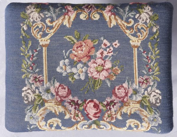 Chippendale Georgian-style mahogany stool. The overstuffed seat with gros-point multi-coloured floral upholstery in perfect condition, over cabriole legs with acanthus carved knees and deeply carved ball and claw feet. Lovely colour and patina and in perfect condition.
