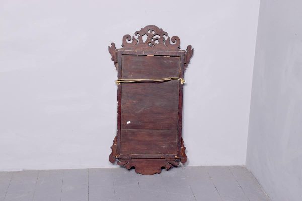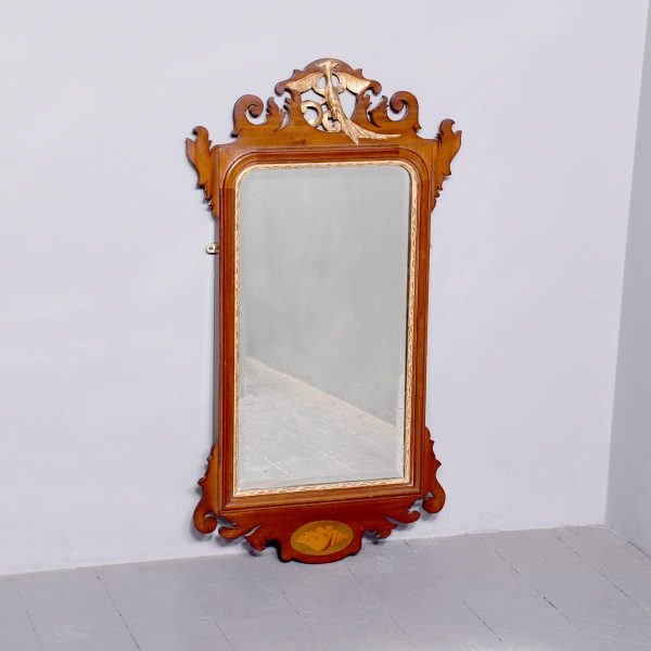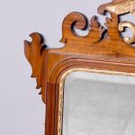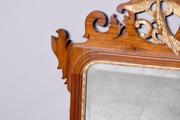 Circa 1880. Chippendale-style gilded mahogany, eagle-mounted wall mirror. Surmounted by a fretted pediment with a gilt carved eagle, the rectangular mirror with fretwork corners and a moulded frame and gilded slip around the bevelled mirror, which is in excellent condition. The base with further fretted panel with conch shell inlay. In excellent condition.