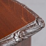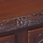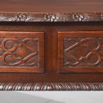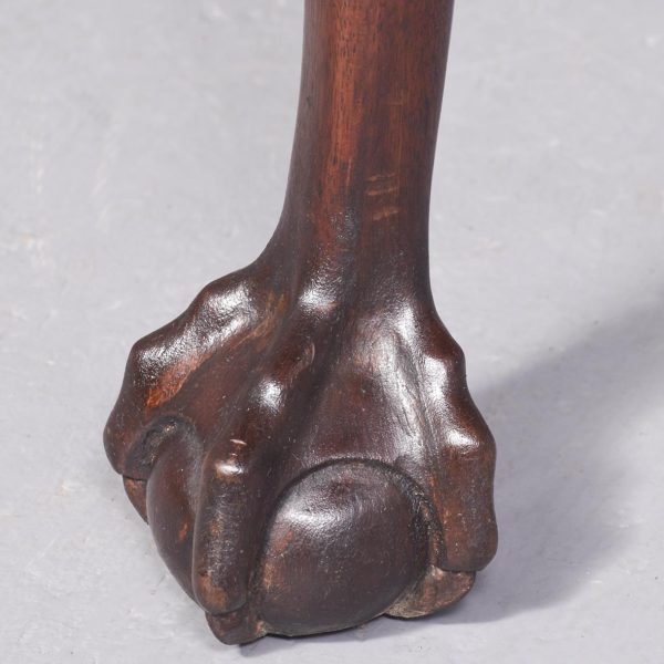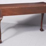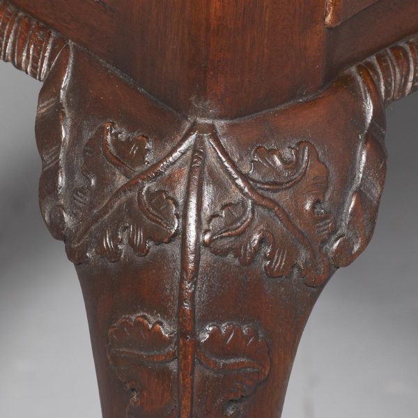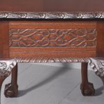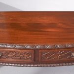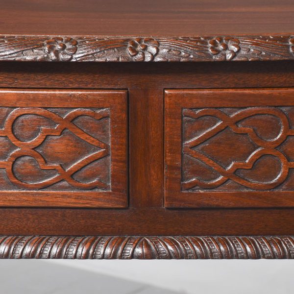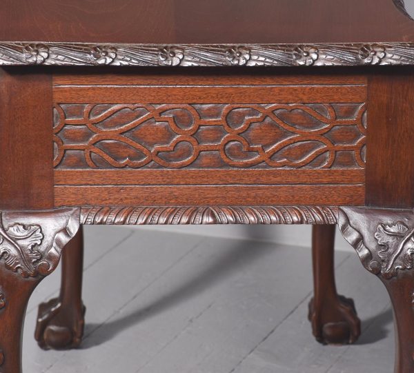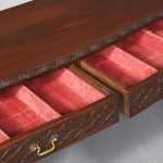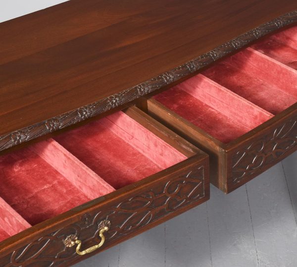 Circa 1970. Chippendale-style, serpentine-fronted mahogany hall table/serving table. The shaped top in figured mahogany with a foliate carved fore-edge above two frieze drawers with blind fret carved fronts and cast brass swan neck handles above a fluted frieze. Supported on cabriole legs with foliate carved knees and ball and claw feet.