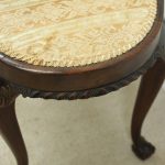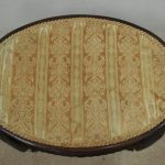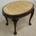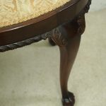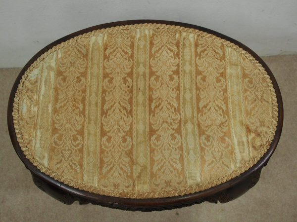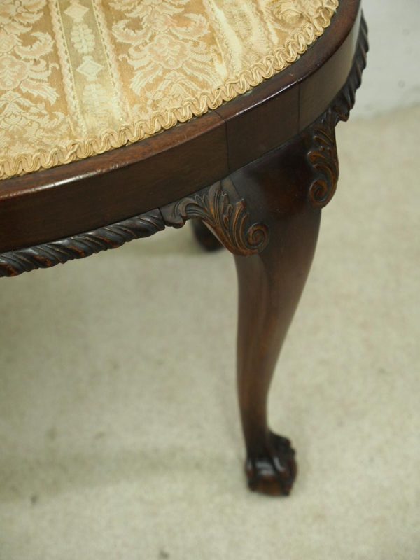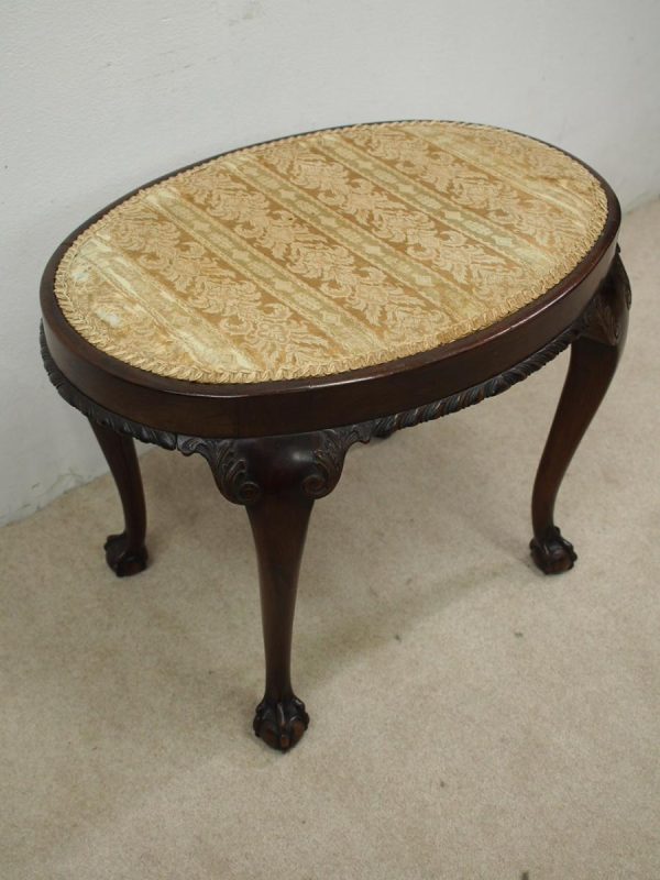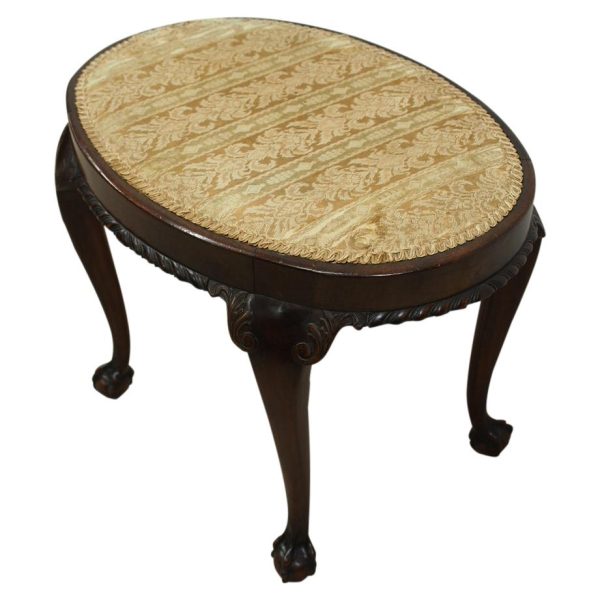Circa 1930, oval mahogany Chippendale style footstool. The inset upholstered top has a moulded rim and gadroon carved frieze, supported by cabriole legs with acanthus carvings to the knees. Finishing on deep ball and claw feet, and with the label of ‘Robson Cabinetmakers, Newcastle’.