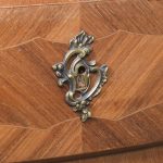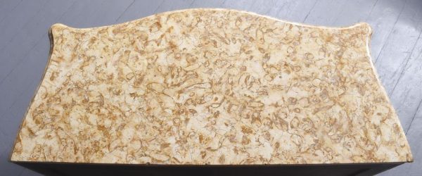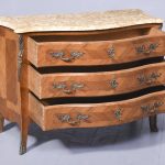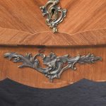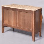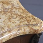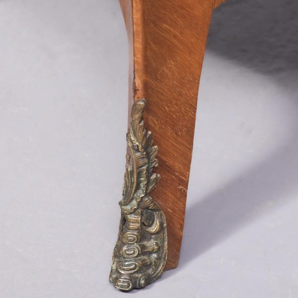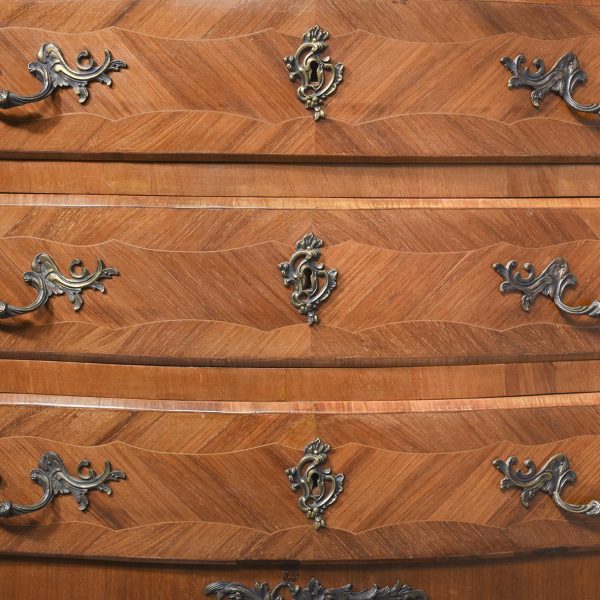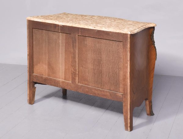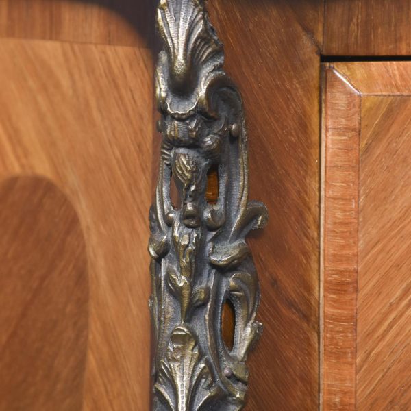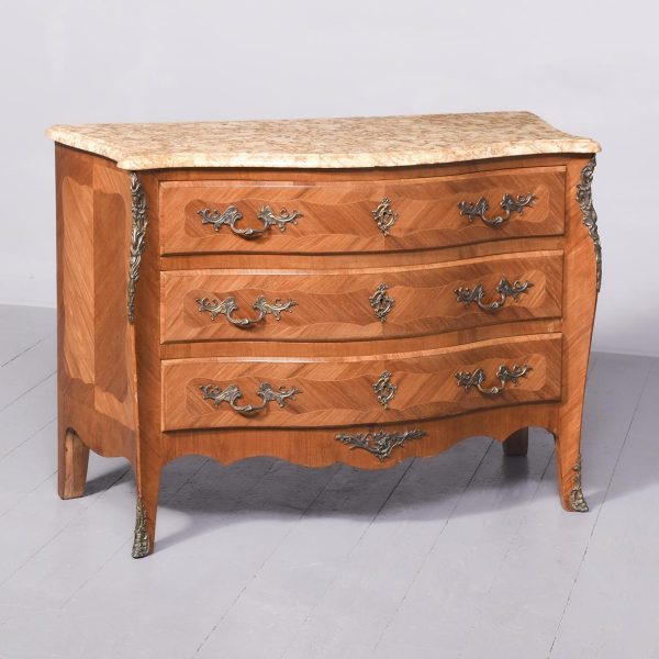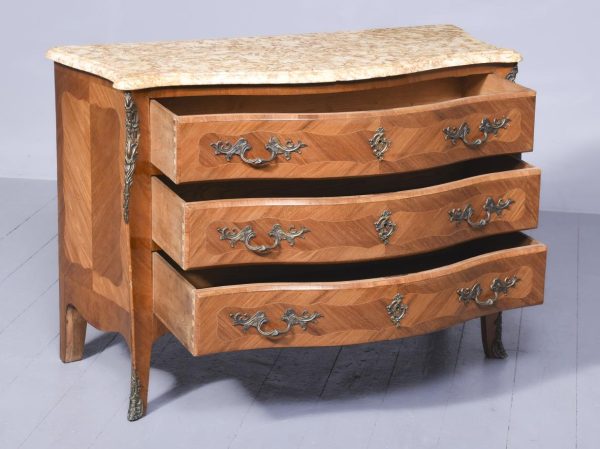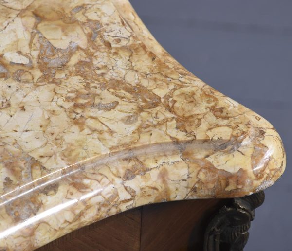 Circa 1920 French Serpentine-Front Marble-Top Kingwood and Walnut Commode. The variegated cream and yellow marble top above three serpentine-fronted drawers with inlaid radial panels of Kingwood, and Rococo brass handles and escutcheons above a mounted skirt. The angled sides with brass capitals extend down as cabriole legs with brass sabots. The sides with mirror matched panels of Kingwood. All in excellent condition.