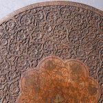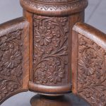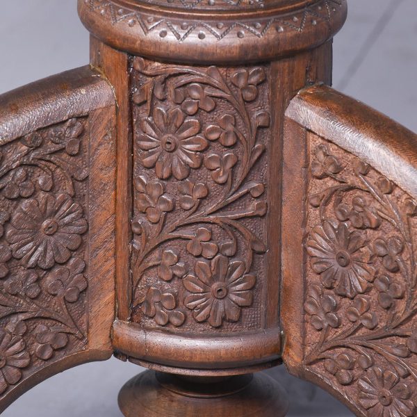 Circa 1880. Circular Ceylonese/Indian brass inlaid and carved occasional table. The circular top finely carved with flower heads and foliage and more centrally a hardwood plaque with finely inlaid brass foliate decorations. All supported on a central finely carved and ring turned stem, with three deep outswept carved cabriole legs with scrolled toes.