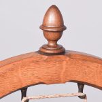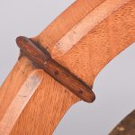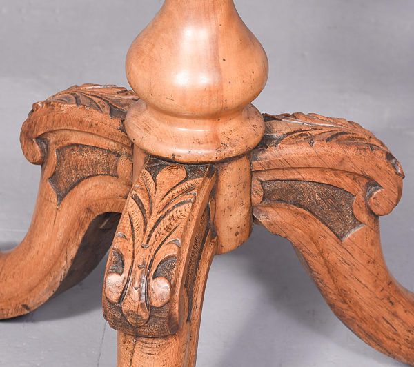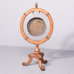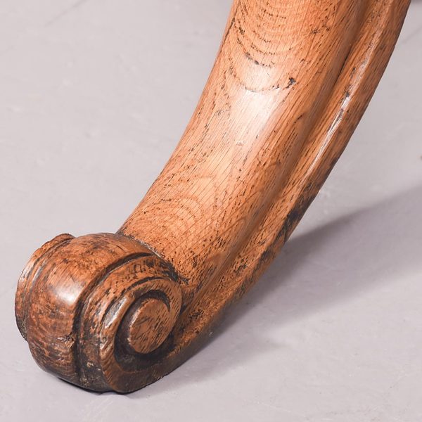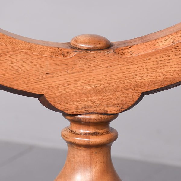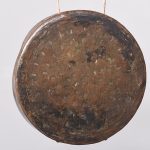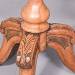 Circa 1850. An early Victorian carved oak free standing dinner gong. The circular stand surmounted by an elegant finial with a circular plamished bronze gong hanging in the centre. The circular top with canted corners with beadings separating each section, all resting on a stylish and bulbous stem, issuing three carved hipped cabriole legs with foliate carving on the tops, finishing on a well curled foot.