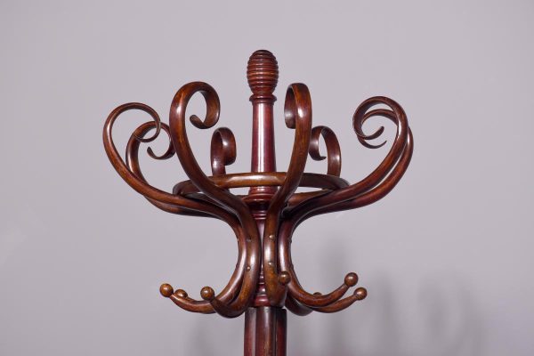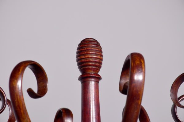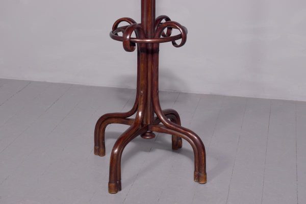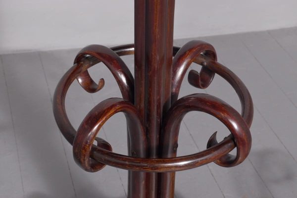 Circa 1900.A stylish 8 arm two-part bentwood hall stand probably by ‘Thornet ’surmounted by acronical ribbed beehive finial with the 8 curvaceous arms, the cluster column stem issuing four stylish feet with curvaceous arms with a circular aperture for holding sticks, the hall stand is clean and stylish with a revolving top.