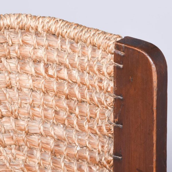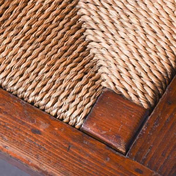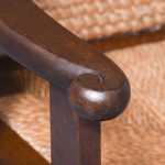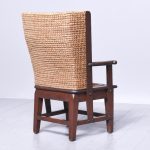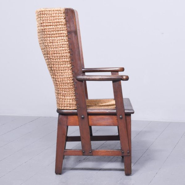 Circa 1920. A pine framed oat straw back Orkney chair of traditional form. The top rail tied down in marram grass, drop in marram grass seat frame, all the straw supported on a pine frame with two shaped arms with a curly end supported on stout uprights. Square tapering legs, back ones slightly out swept. All the legs are braced by conforming stretchers.