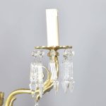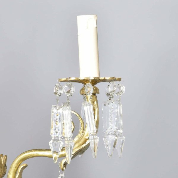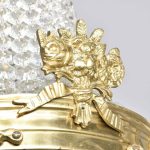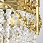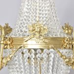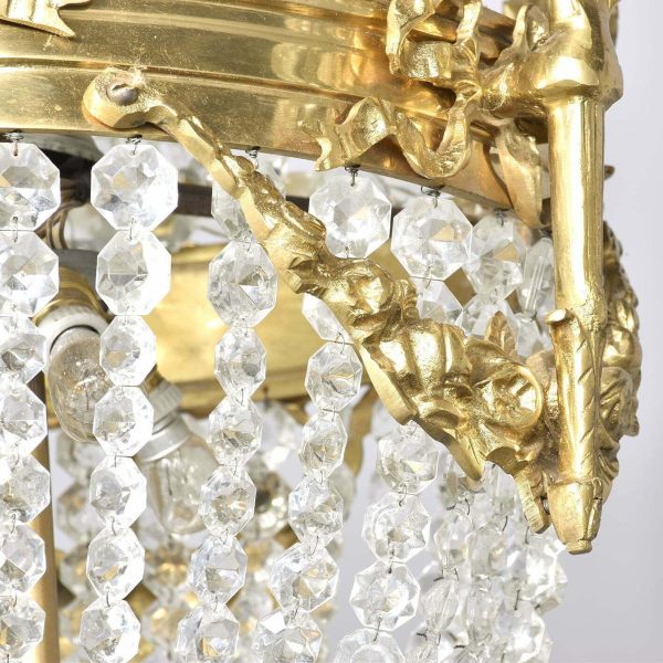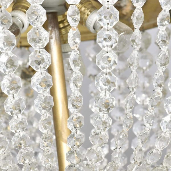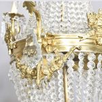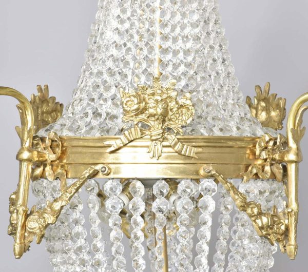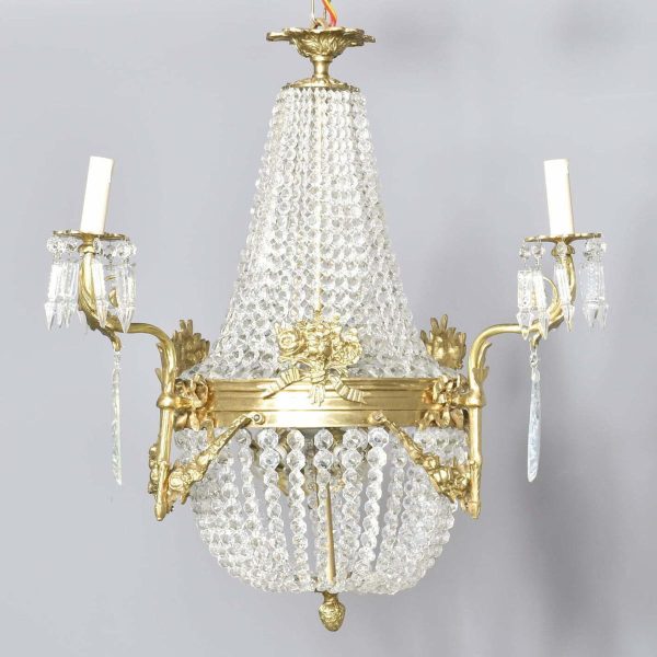 Circa 1930s. Cut crystal and brass tent and basket chandelier. The top with cast brass mounts over a tent of shaped crystal chains above central brass band with cast foliate mounts and supporting three shaped candelabra (electrified) with crystal drops. beneath is cut crystal basket above a cast brass finial. In perfect condition.