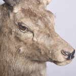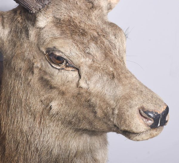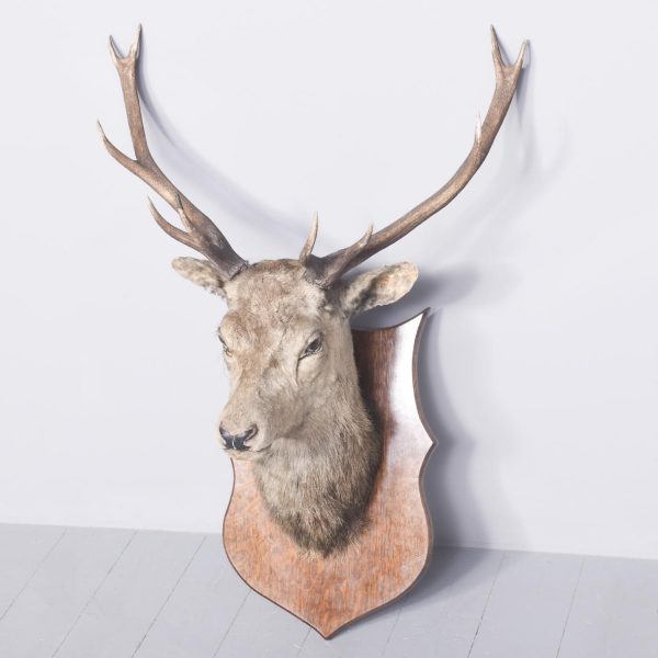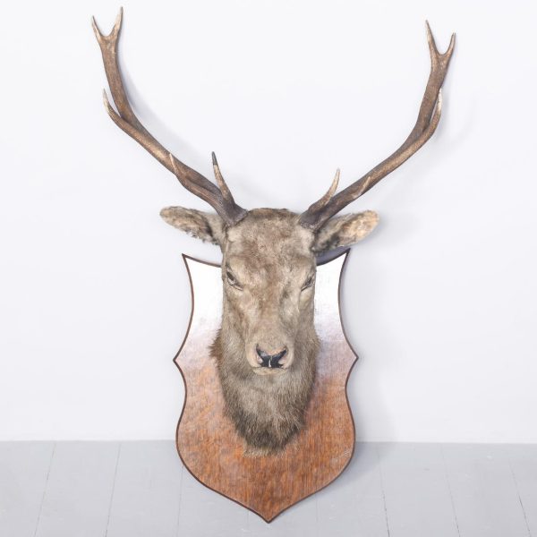 Circa 1920s. A good Taxidermy deer head on a polished oak heraldic shaped shield. The 10 point antlers on a well preserved head with realistic glass eyes, the antlers, head and shield all in good condition.