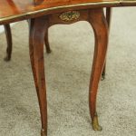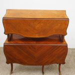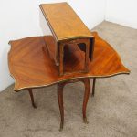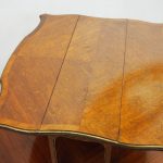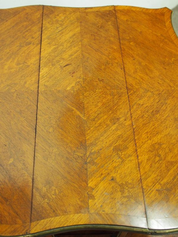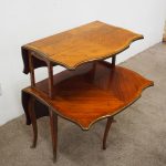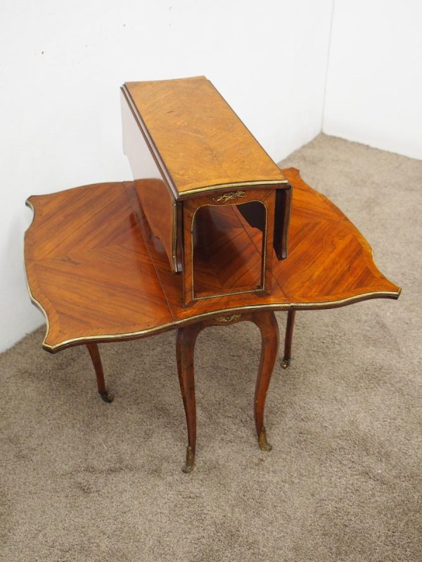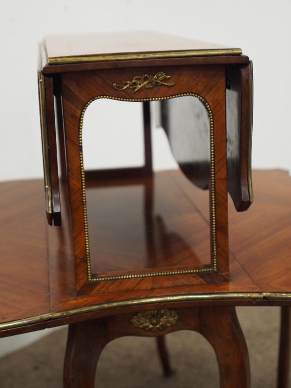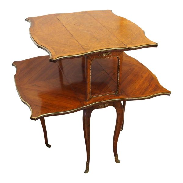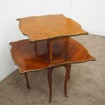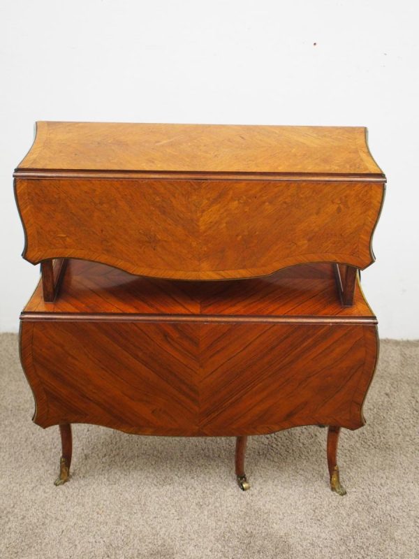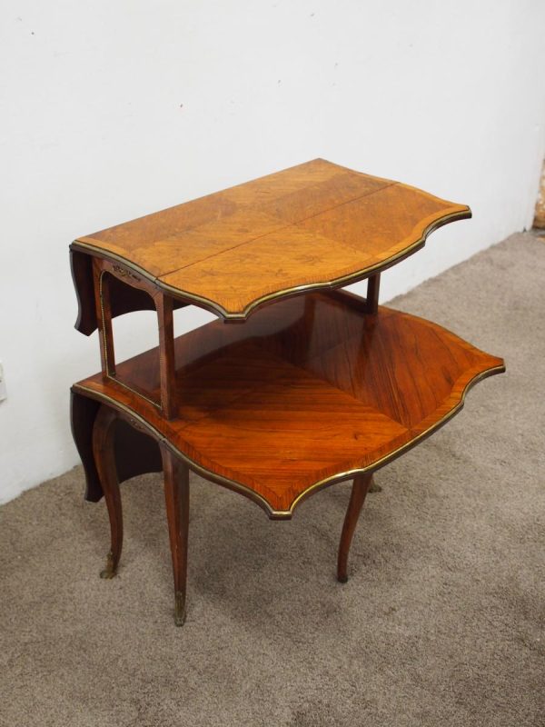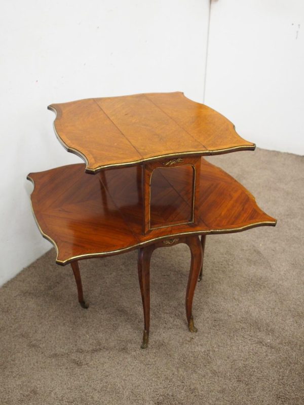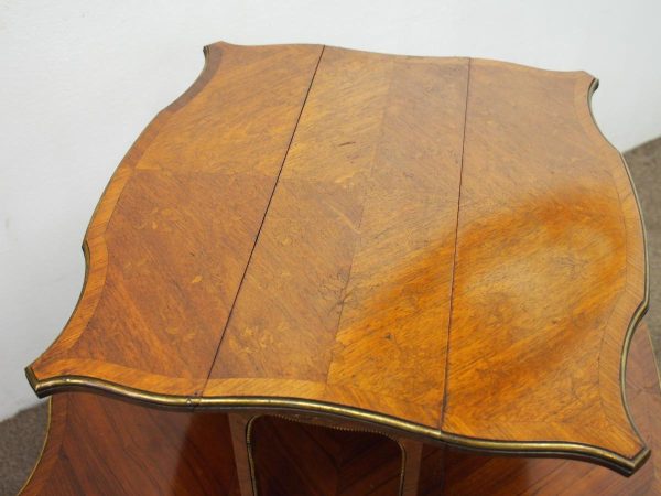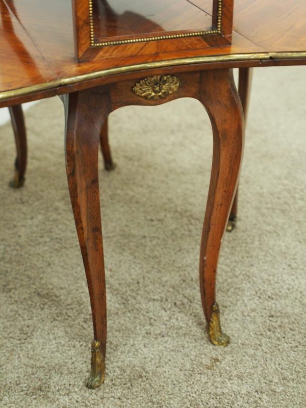 Circa 1890, Exhibition quality, rare double Sutherland table or etagere by the famous cabinetmakers, Morison of Edinburgh. The serpentine shaped table flaps have profuse marquetry inlaid and figured walnut on the top layer and a rosewood lower layer, all with kingwood banding and cast brass rims. The top section is on an arched support with ormolu mounts, and the lower section is on cabriole legs with ormolu sabots.