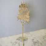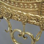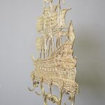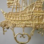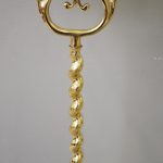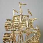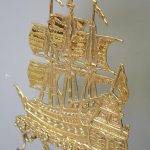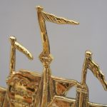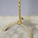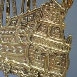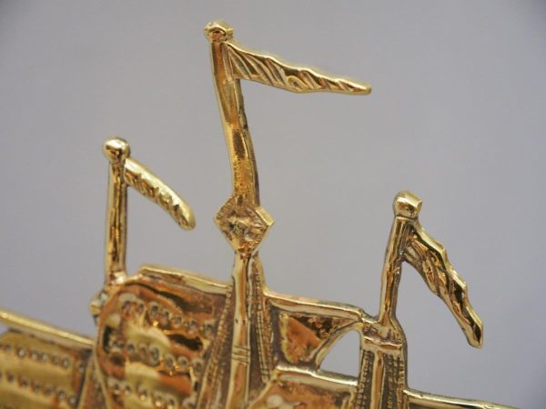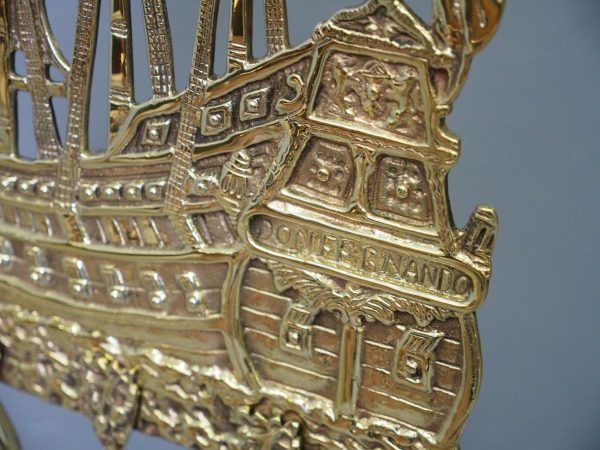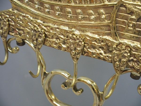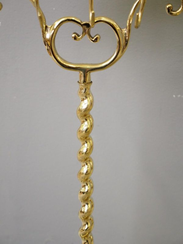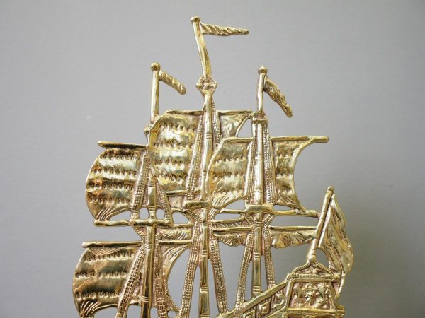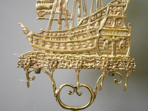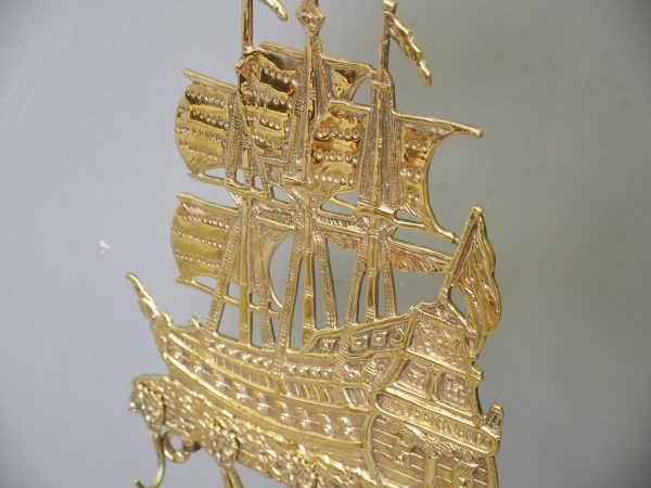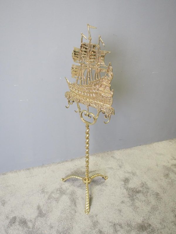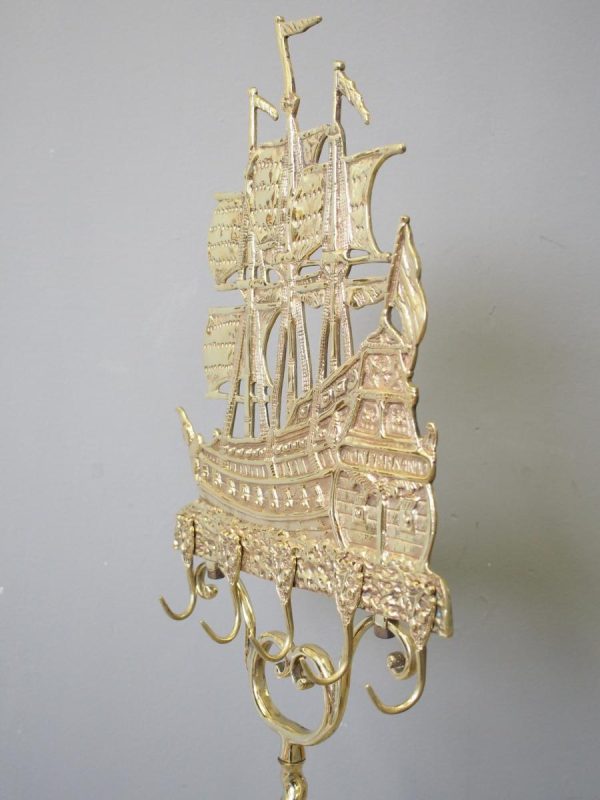 Circa 1900, unusual Dutch fire tool stand with a ship design. The cast brass top depicts the sailing ship and has 5 hooks attached to its base by scrolling cast brass. With a cast brass barley sugar stem, continuing down to the circular bezel and 3 barley sugar feet. Recently cleaned, it could also be used for storing keys, etc.