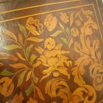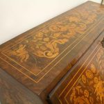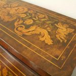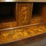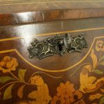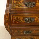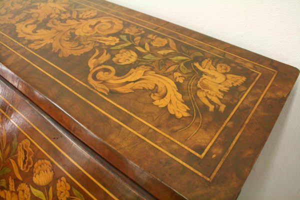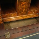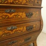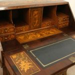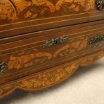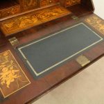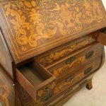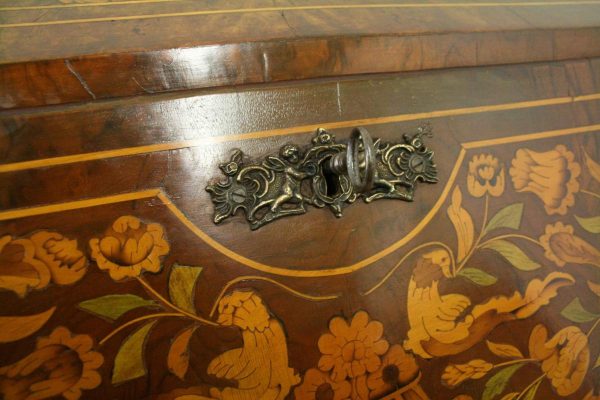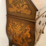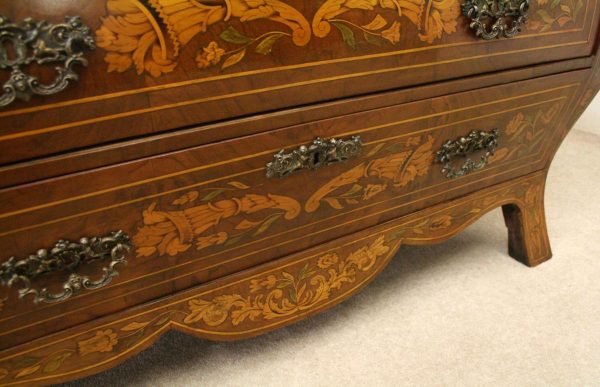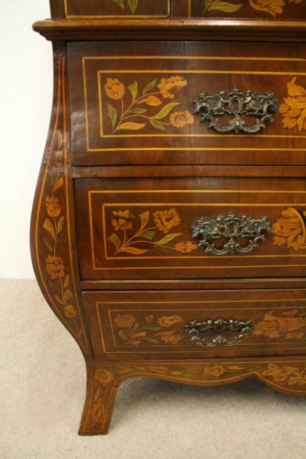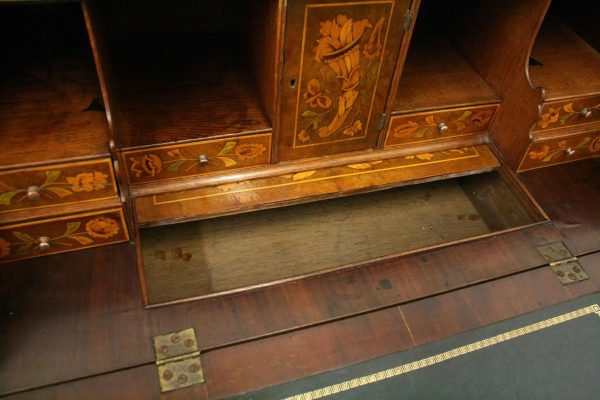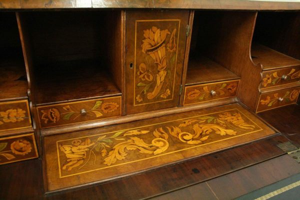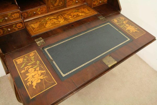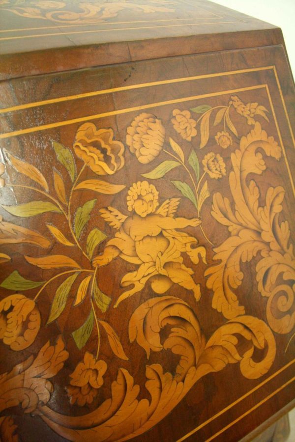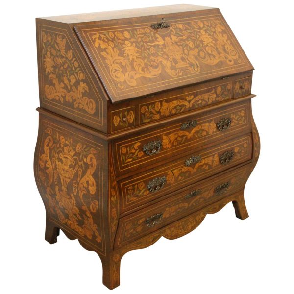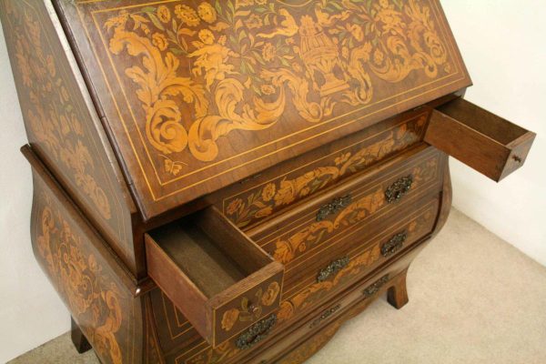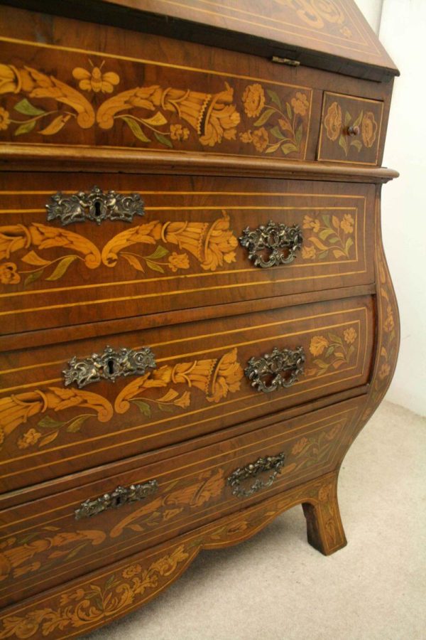 Circa 1850, Dutch marquetry inlaid bombé bureau, the flap opening to show an elaborately inlaid fitted interior with well. The flap is held by two small drawers, and below this are three further long drawers all smothered in floral marquetry. Below the bottom drawer is a shaped apron and the whole piece stands on splayed feet.