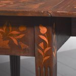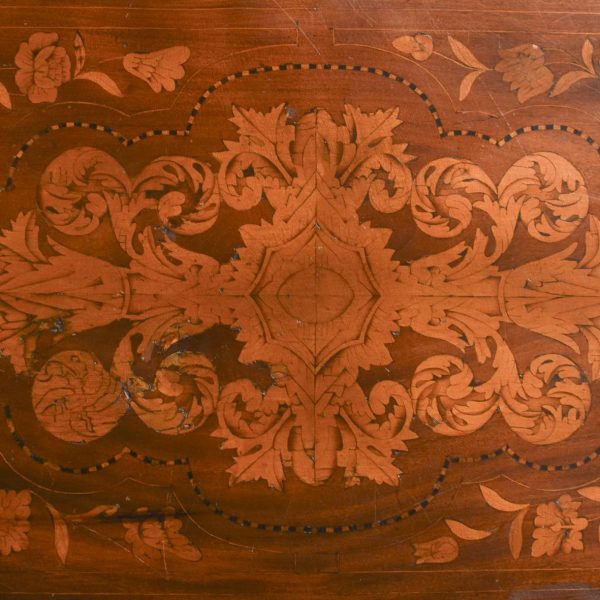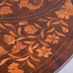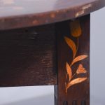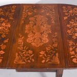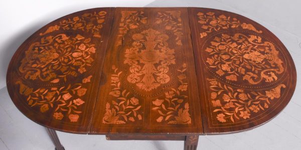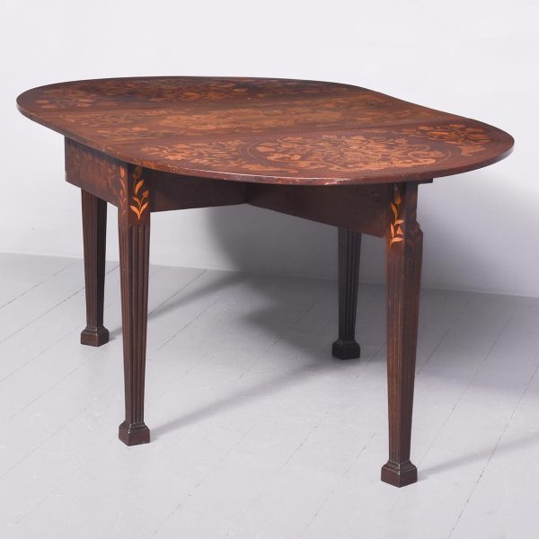 Circa 1820. An unusual stylish Dutch marquetry drop leaf dining table or side table, the top and two D-shaped flats smothered in classic Dutch marquetry, including flowers with the center panel on the top in the form of a foliate cartouche, the drop-leaves with large panels including flowers and birds, these are supported by the hinged legs when open, all resting on four elegant square tapering and fluted legs finishing on a block foot.