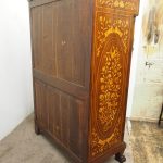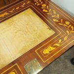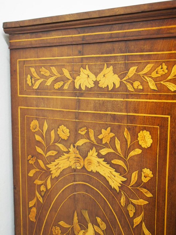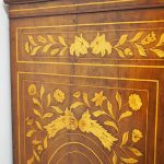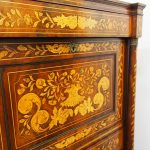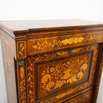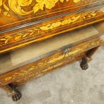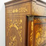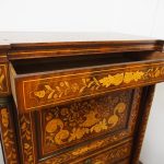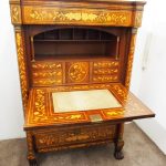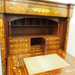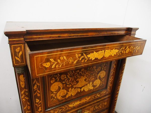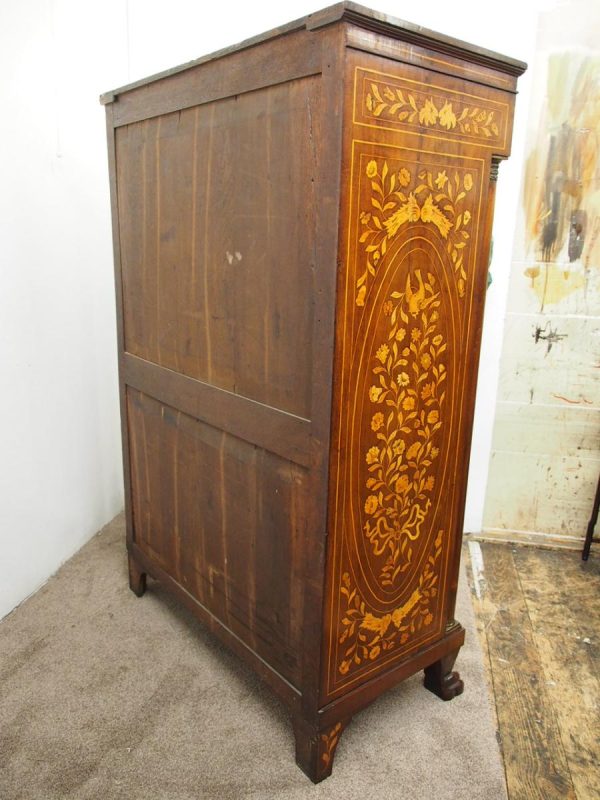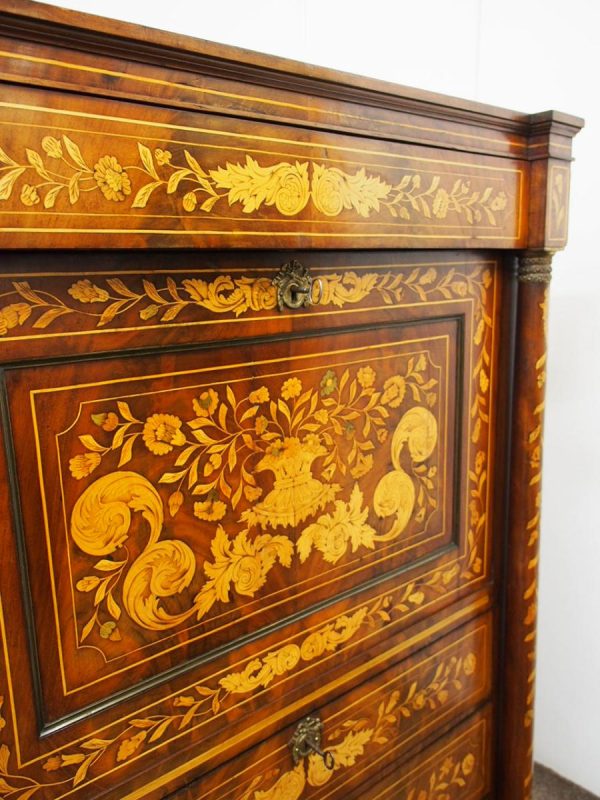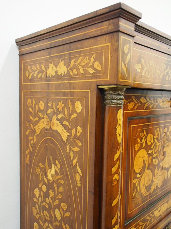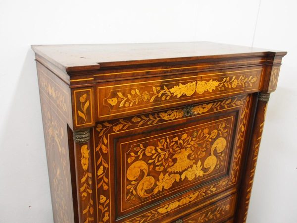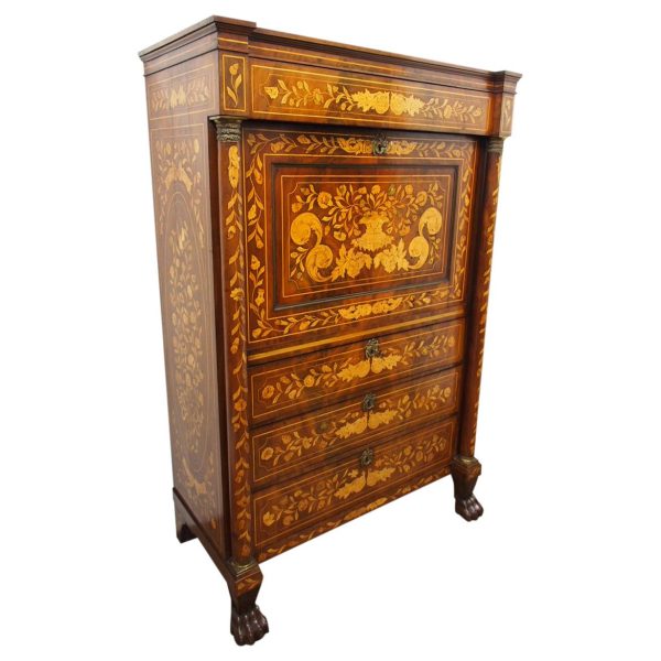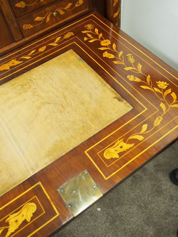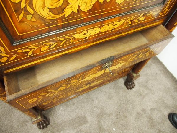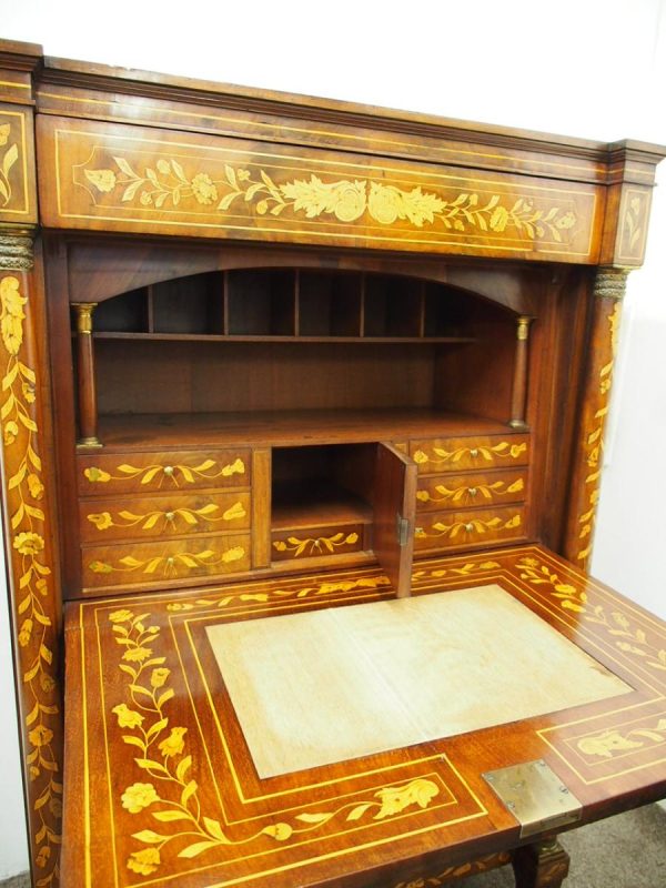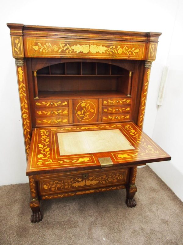 Circa 1820, exhibition quality Dutch marquetry fall front escritoire. With solid oak top and simple fore-edge, the front and gables are covered in finest Dutch marquetry, and it features a full length drawer to top with columns either side. The columns are decorated with further marquetry and brass capitals, and the escritoire opens up to reveal a writing surface, pigeon holes and a small cupboard with small drawers. Beneath the escritoire are 3 further drawers with a simple marquetry covered apron and standing on bracket feet to the back and realistic animal feet to the front. Height to writing surface 84 cm.