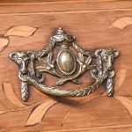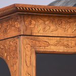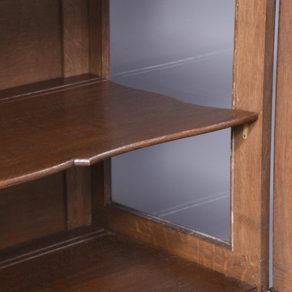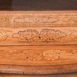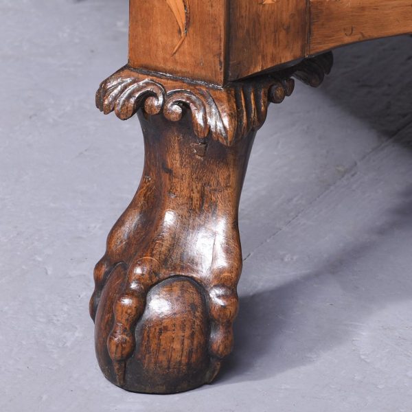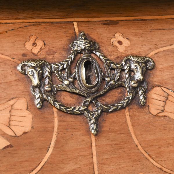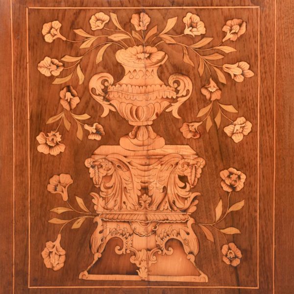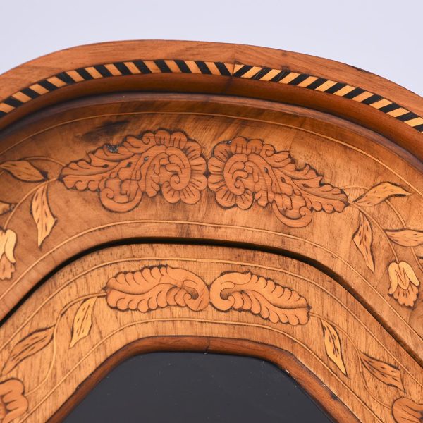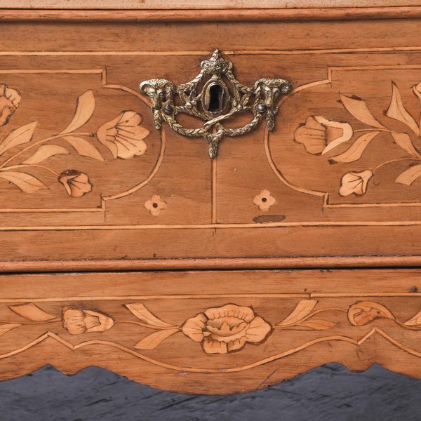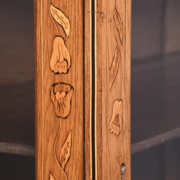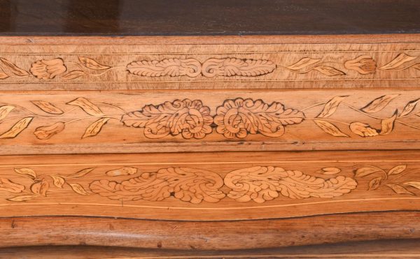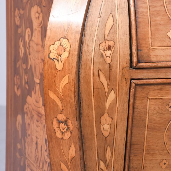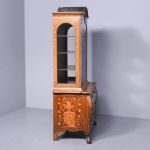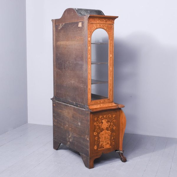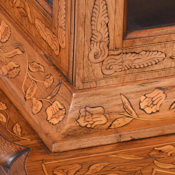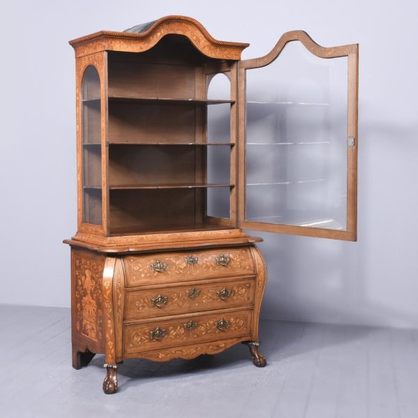Circa 1850. Dutch marquetry inlaid walnut bookcase or display cabinet on chest. Surmounted by an arched cornice with chequered inlay above a frieze inlaid with boxwood lines and foliage and floaral marquetry. The arched door with matching marquetry inlaid frames and the side with glazed and marquetry inlaid arched panels. All sitting on a concave base above marquetry chest with shaped and moulded fore edges above three cock beaded inlaid bombe front drawers with original rococo, brass handles and escutcheons and with an inlaid skirt below. Supported on carved ball and claw feet in front and shaped bracket feet behind. In excellent condition.