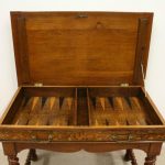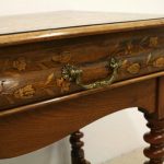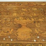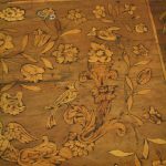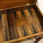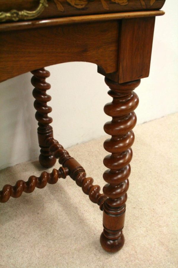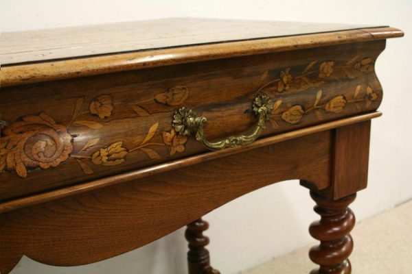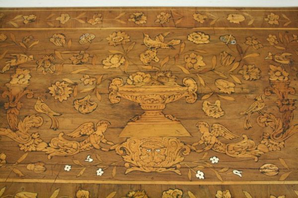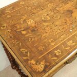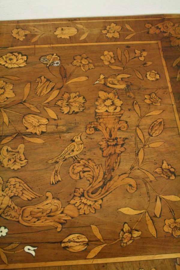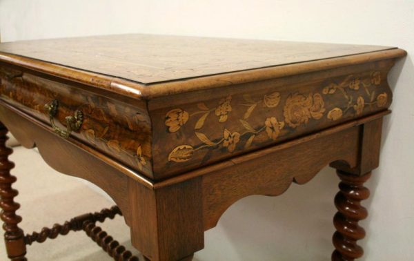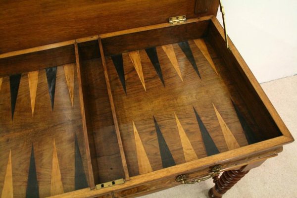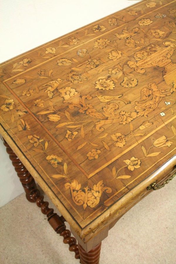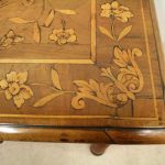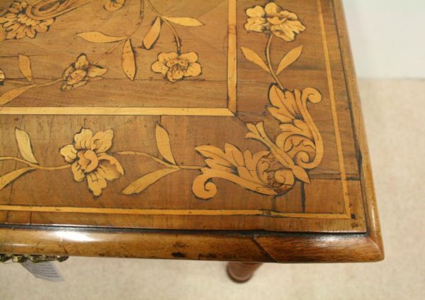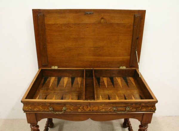 Circa 1820, Dutch marquetry side table, the top opening to reveal a backgammon board. Fine quality marquetry including ivory and mother of pearl inlay. Standing on later barley twist turned supports united by barley twist stretchers.