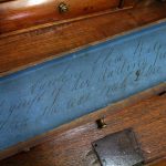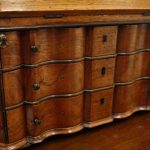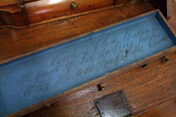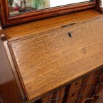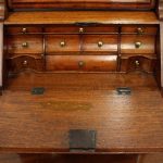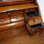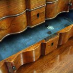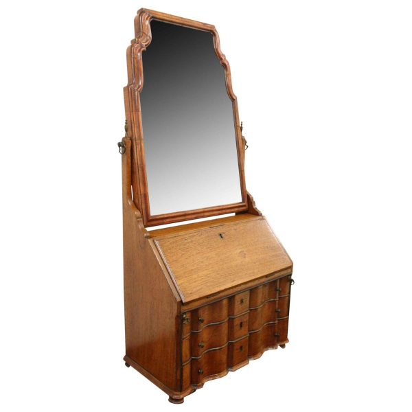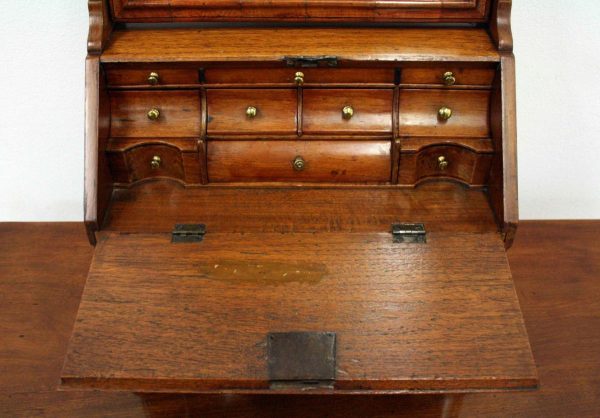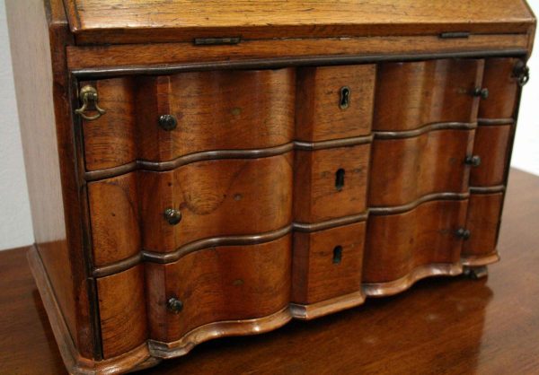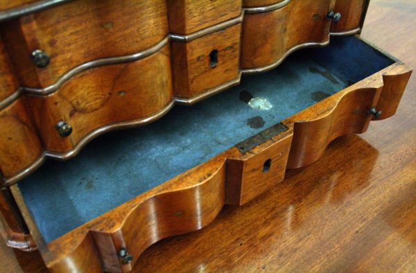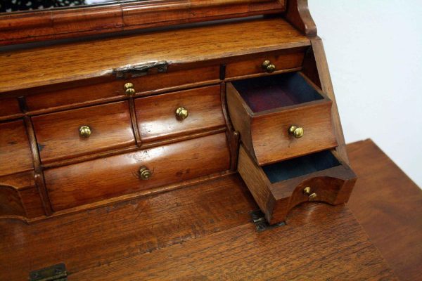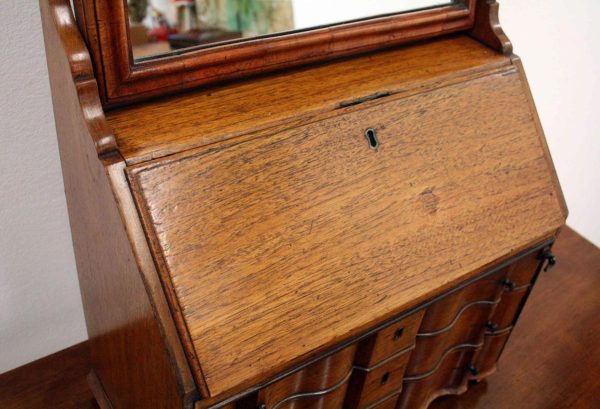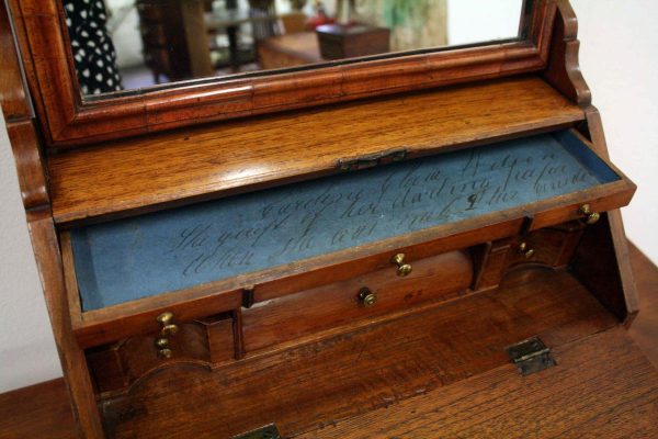 Circa 1800, Dutch walnut dressing mirror in the form of a bureau. The mirror is contained in a shaped moulded frame, over a flap which opens to reveal an elaborate stepped and shaped interior. Below this are 3 block front drawers, and all stands on squat ogee bracket feet. Inside the top interior drawer is an inscription made out to ‘Caroline Clara Wilson’.