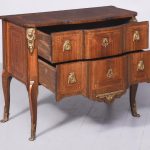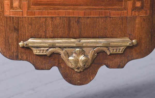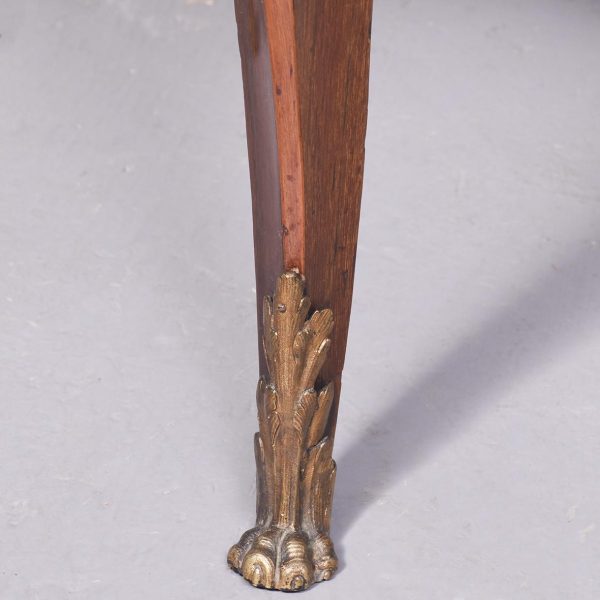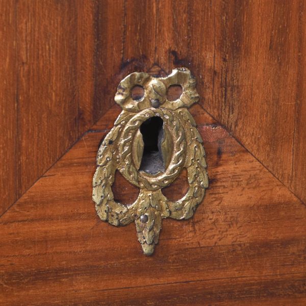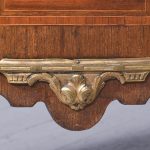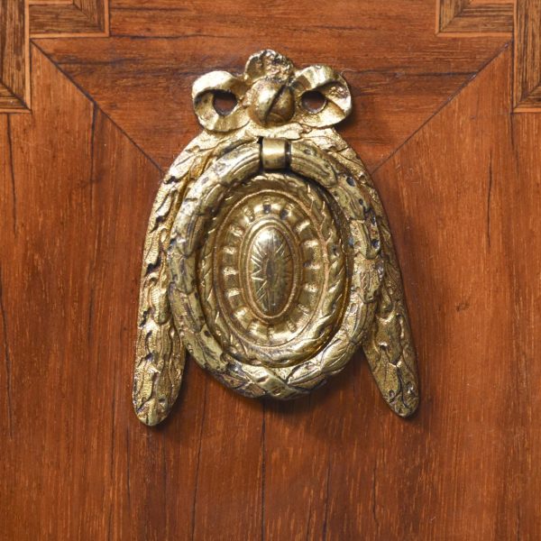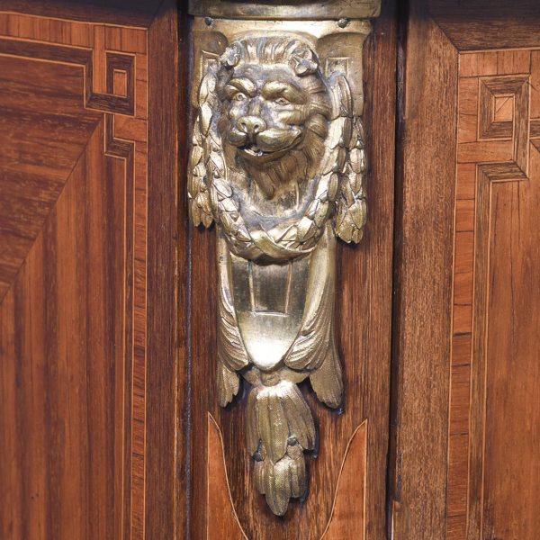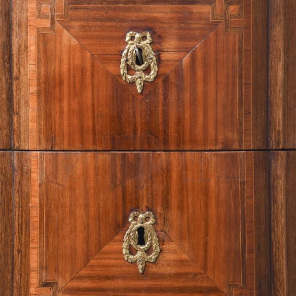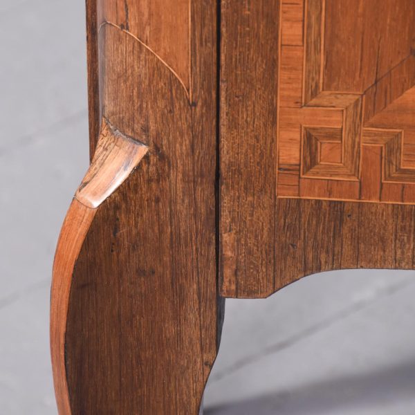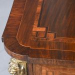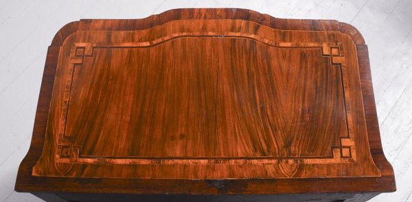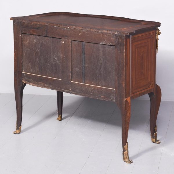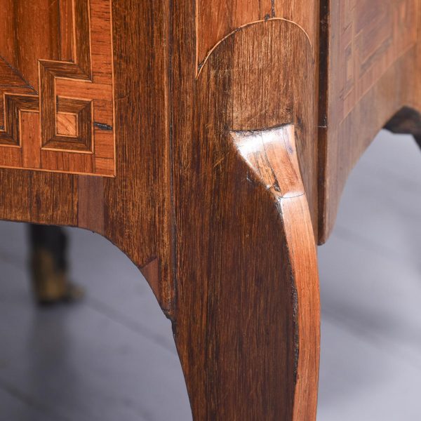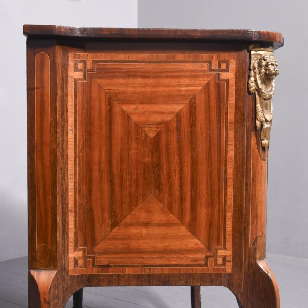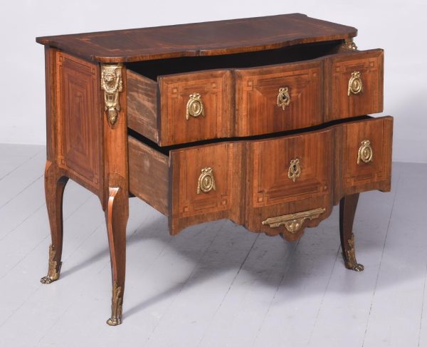 Circa 1820. Early 19th century French inlaid rosewood two drawer commode. The serpentine shaped inlaid and crossbanded top above two shaped-front drawers with original brass escutcheons and handles, the lower drawer with a brass-mounted skirt. The rounded corners with lion head mounts & the sides with panels of rosewood and walnut. Supported on neat cabriole legs with brass lion claw feet. Lovely colour and patina.