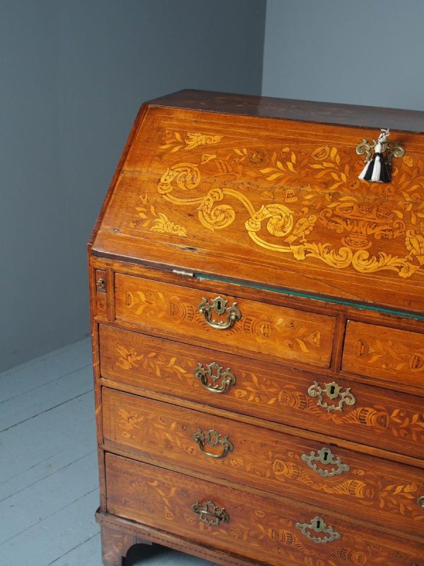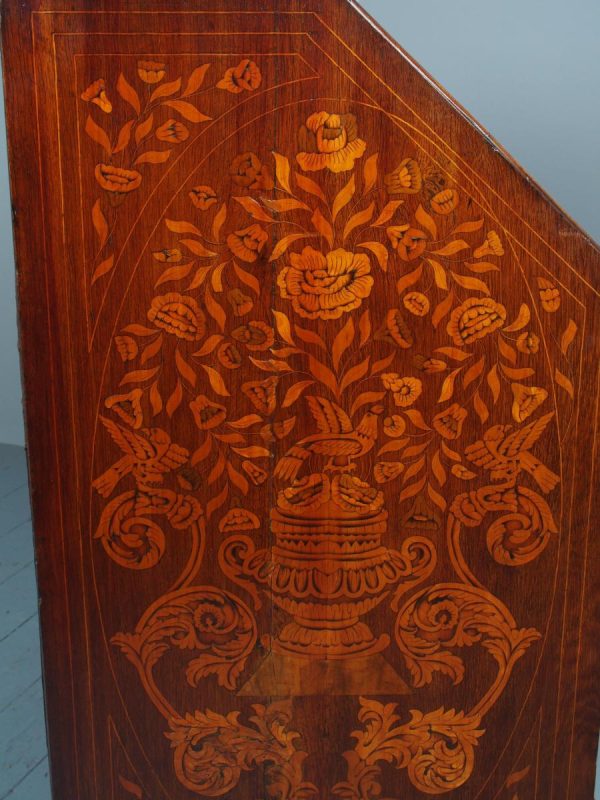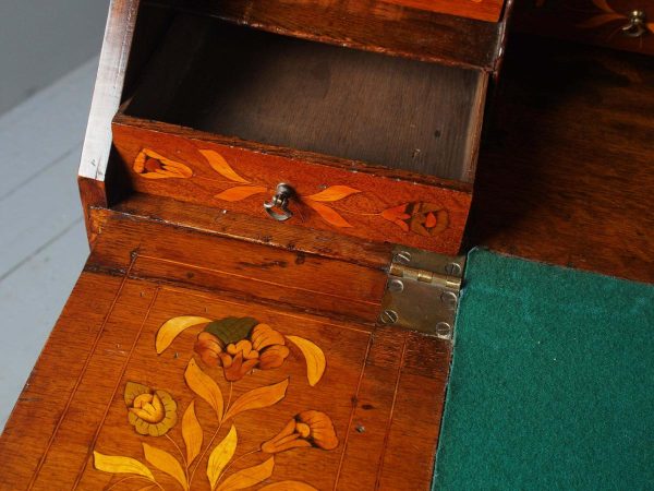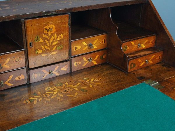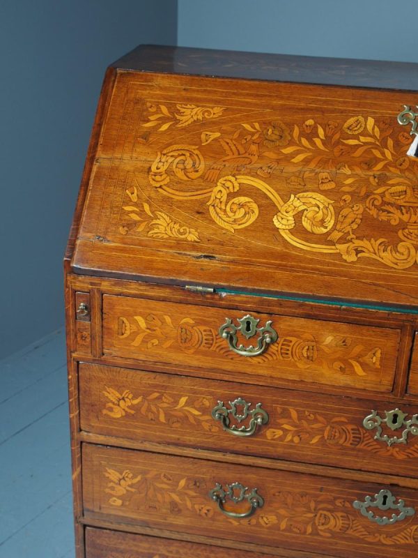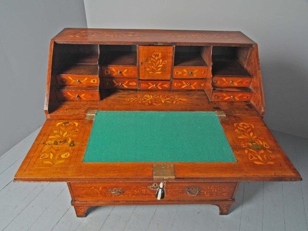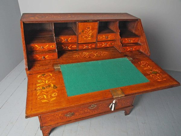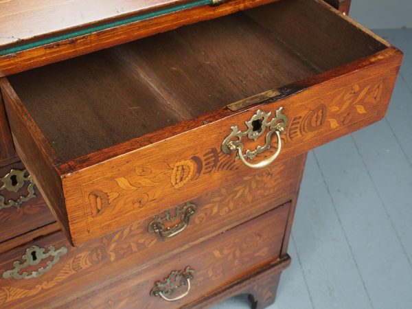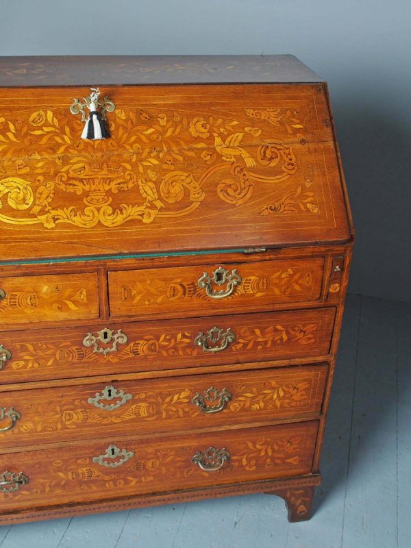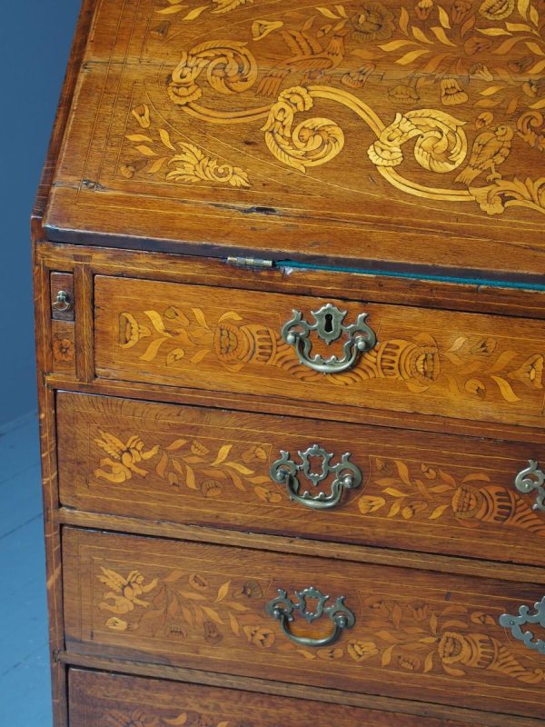 Circa 1820, unusual and large Dutch marquetry and oak frame bureau. The rectangular top with floral marquetry panels with a classic Dutch inlaid design of birds, swag tails and urns to the flap and a cast brass, pierced escutcheon. Opening to a fitted interior and felt covered writing surface surrounded by further marquetry. It has 2 short over 3 full length drawers with cast brass swan neck handles and inlaid designs, with the 2 lopers with cast brass axe head drops. Beneath is a chequered inlaid frieze, standing on 2 bracket feet with marquetry inlay and the gables featuring similar inlaid designs.