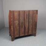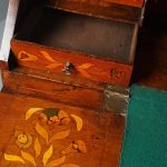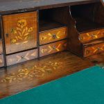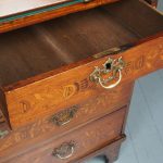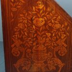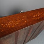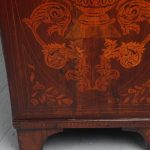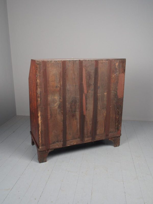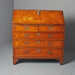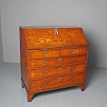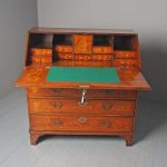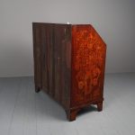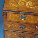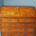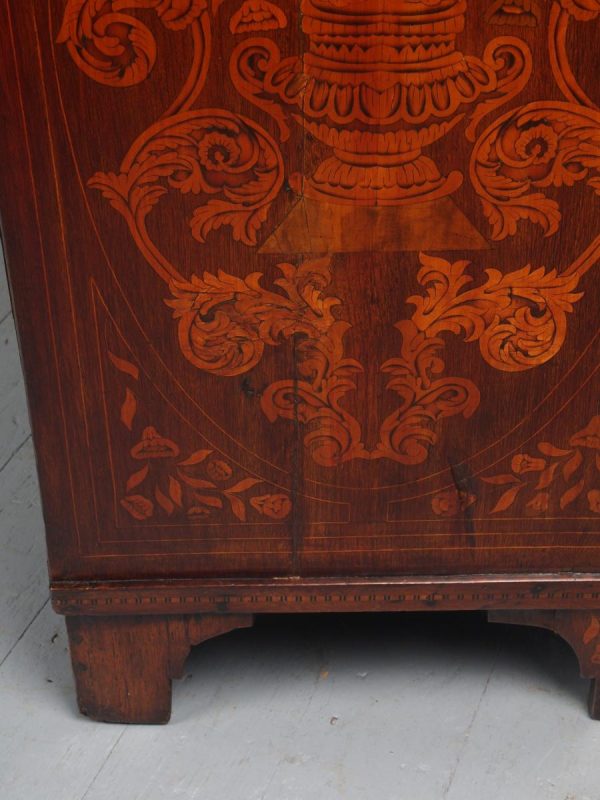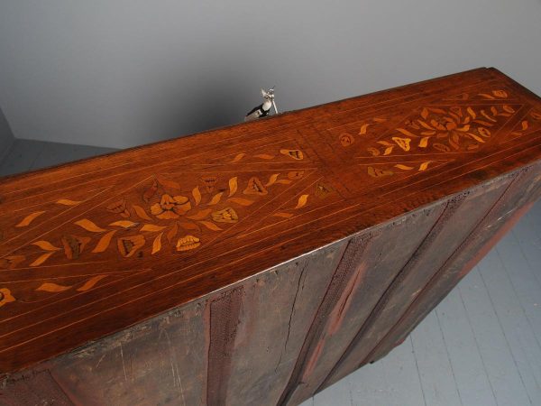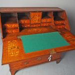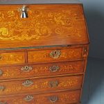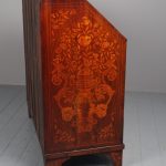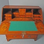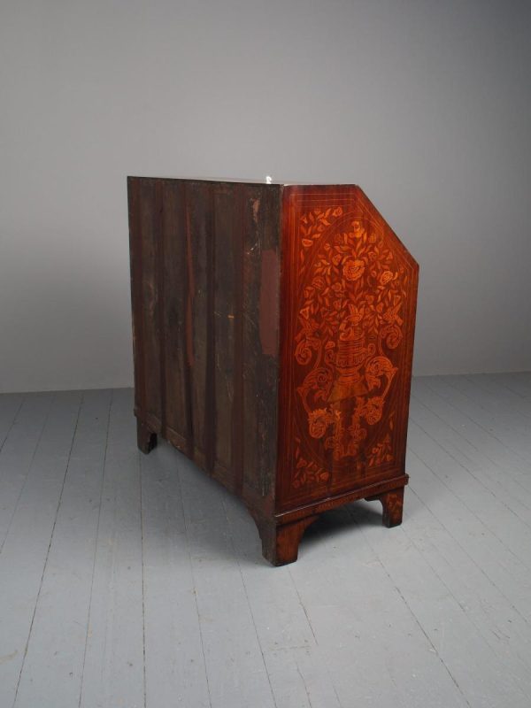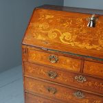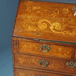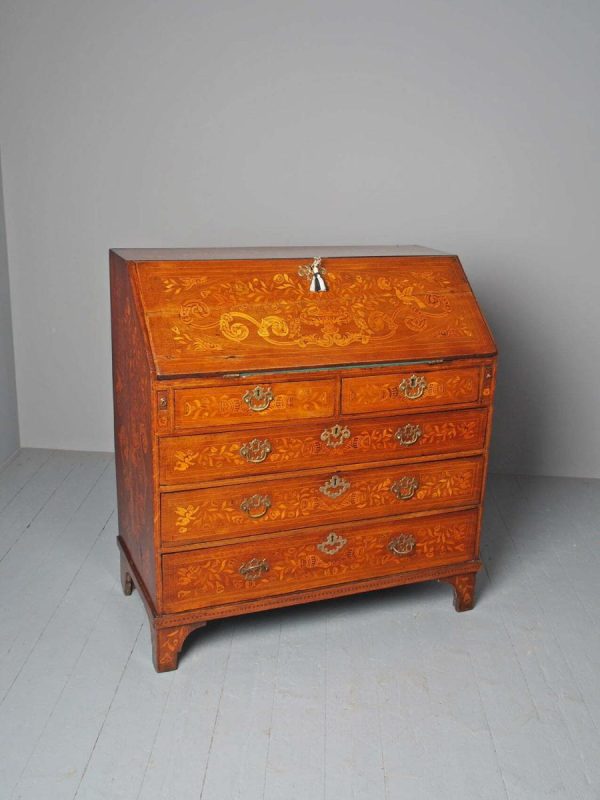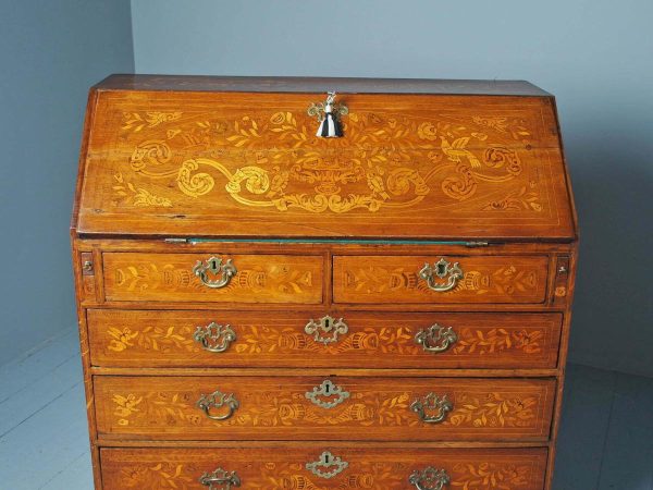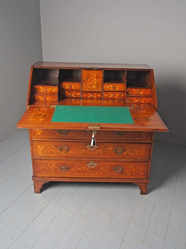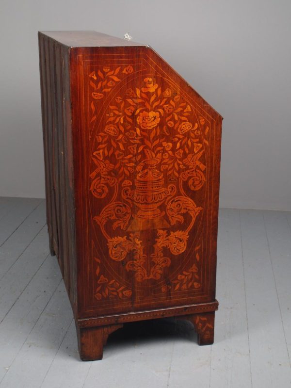 Circa 1820, unusual and large Dutch marquetry and oak frame bureau. The rectangular top with floral marquetry panels with a classic Dutch inlaid design of birds, swag tails and urns to the flap and a cast brass, pierced escutcheon. Opening to a fitted interior and felt covered writing surface surrounded by further marquetry. It has 2 short over 3 full length drawers with cast brass swan neck handles and inlaid designs, with the 2 lopers with cast brass axe head drops. Beneath is a chequered inlaid frieze, standing on 2 bracket feet with marquetry inlay and the gables featuring similar inlaid designs.