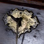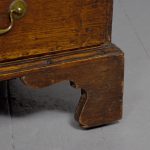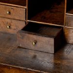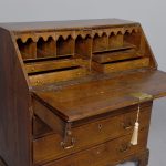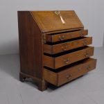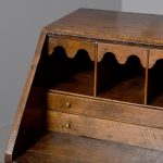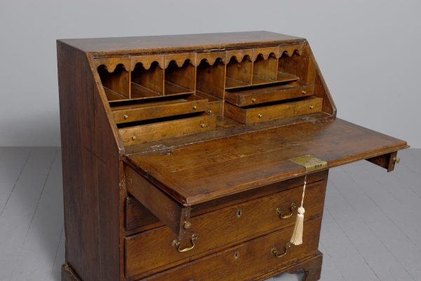 Circa 1860, an early George III oak bureau of desirable proportions, the flap with a very elegant engraved escutcheon, inside is well appointed, with wavy arches, three which are disguise drawers, various pigeonholes and drawers of various lengths, and a solid oak writing surface, beneath the flap left and right is a pair of lopers and four graduating drawers, each with oval escutcheons and swan neck cast brass handles with oval back plates, all resting on bracket feet.