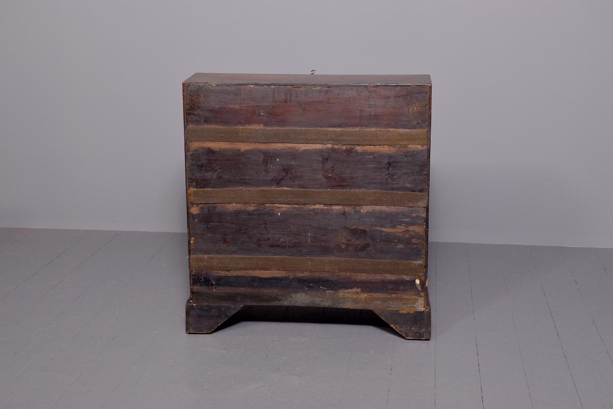 Circa 1860, an early George III oak bureau of desirable proportions, the flap with a very elegant engraved escutcheon, inside is well appointed, with wavy arches, three which are disguise drawers, various pigeonholes and drawers of various lengths, and a solid oak writing surface, beneath the flap left and right is a pair of lopers and four graduating drawers, each with oval escutcheons and swan neck cast brass handles with oval back plates, all resting on bracket feet.